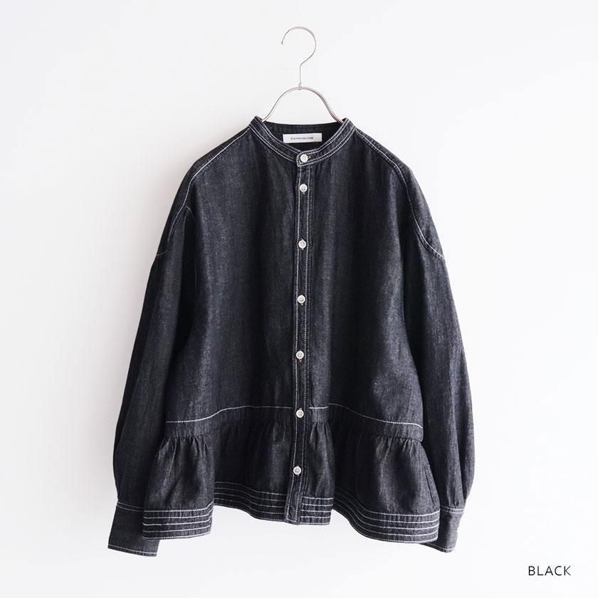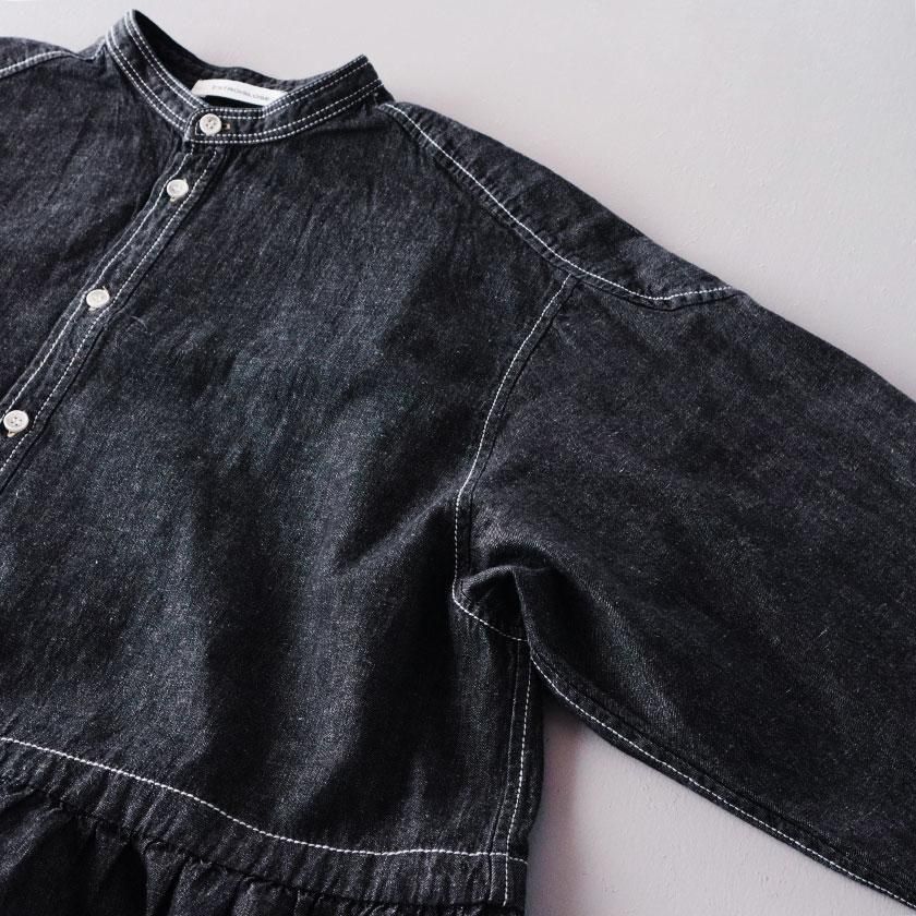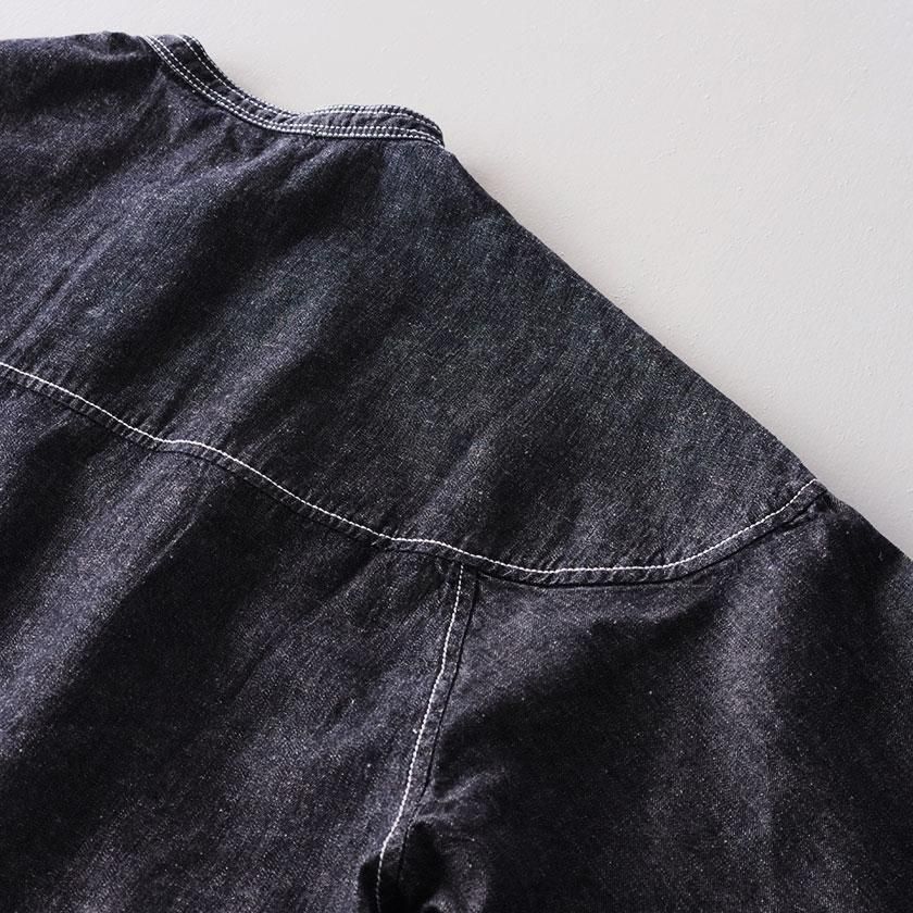 生地には薄手で軽い6ozの綿麻デニム生地を使用。柔らかくしなやかなコットンとリネンのさらりとした風合いを兼ね備えた仕上がりになっています。デニム特有のゴワゴワ感のないソフトな着心地が魅力で、着用や洗濯を繰り返すことで色が落ち、エイジングを楽しめる一着です。