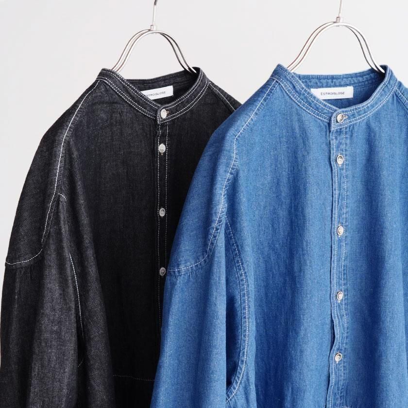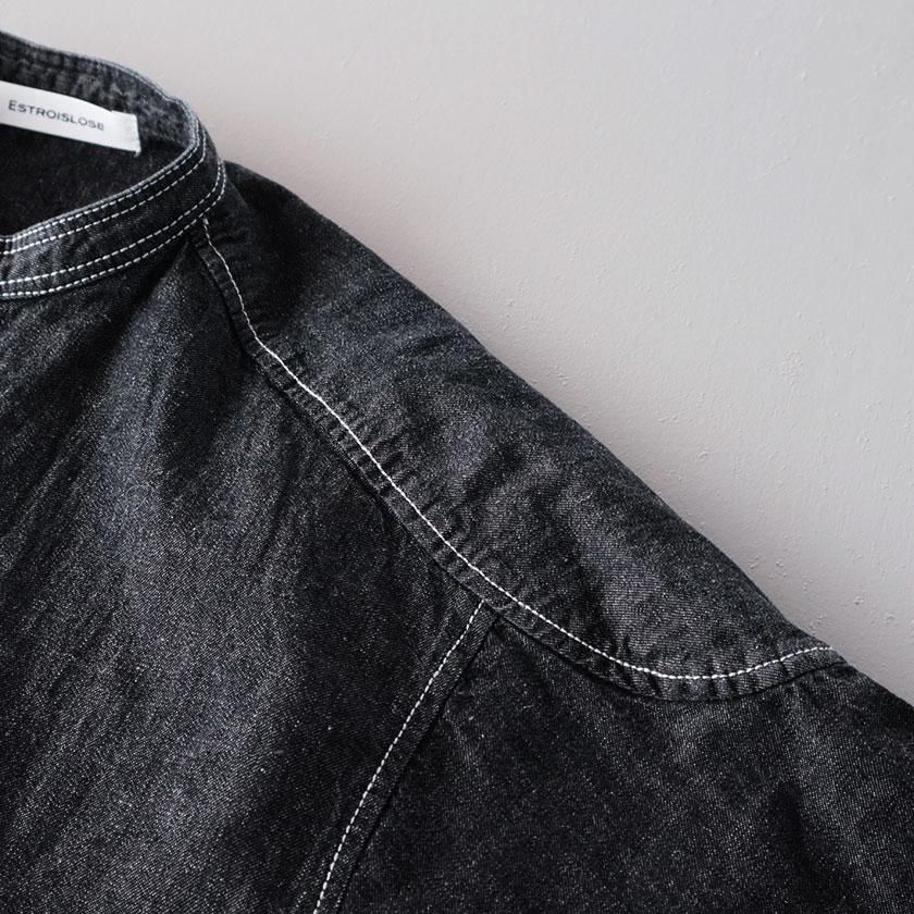 裾のフリルと大胆に施したステッチが特徴的なデザイン。ゆったりワイドな身幅に肩落ちのデザインがリラックスムード漂う雰囲気を演出しています。首元はスマートな印象のバンドカラーにすることで全体を引き締めています。裾の切り替え部分の内側にはドローコードが付いており、絞ってシルエットを変化させても◎後ヨークから肩にかけての個性的な切り替えが一癖をプラスし、ESTROISLOSEらしいデザイン性の高い仕上がりになっています。