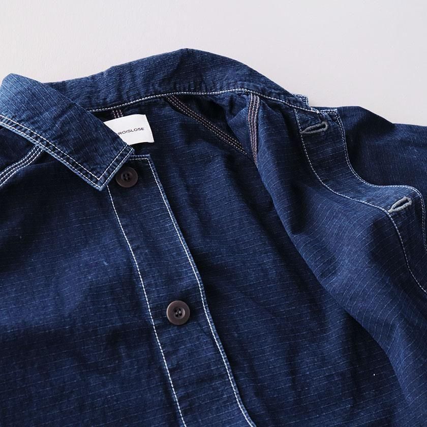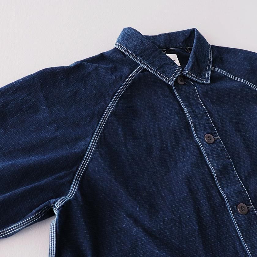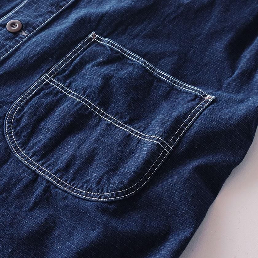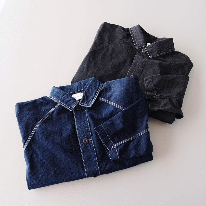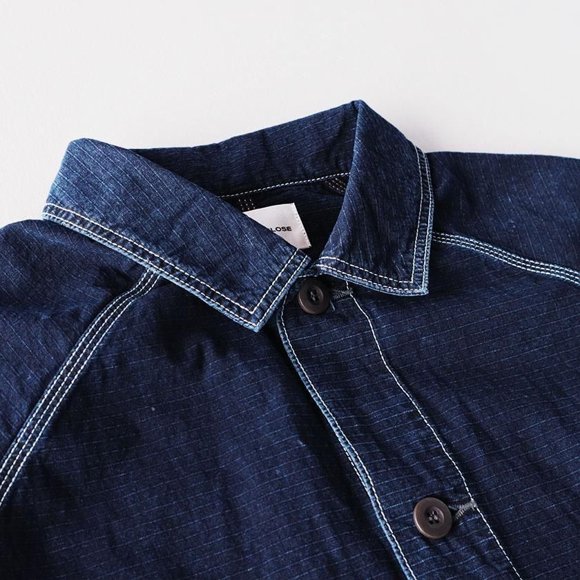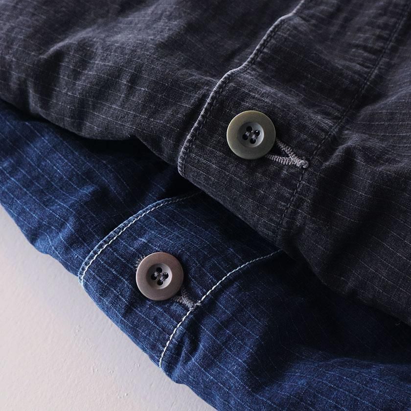 コットンの太い糸を格子状に織り込んだ丈夫で破れにくいリップストップ生地を使用。ストーンウォッシュ加工を施すことで自然なアタリや不均一な色落ちが生まれ、長年着込んだようなユーズド感を表現しています。ほどよい肉感ながらもくったりと柔らかく、軽やかな着心地で季節の変わり目に重宝する一着です。
