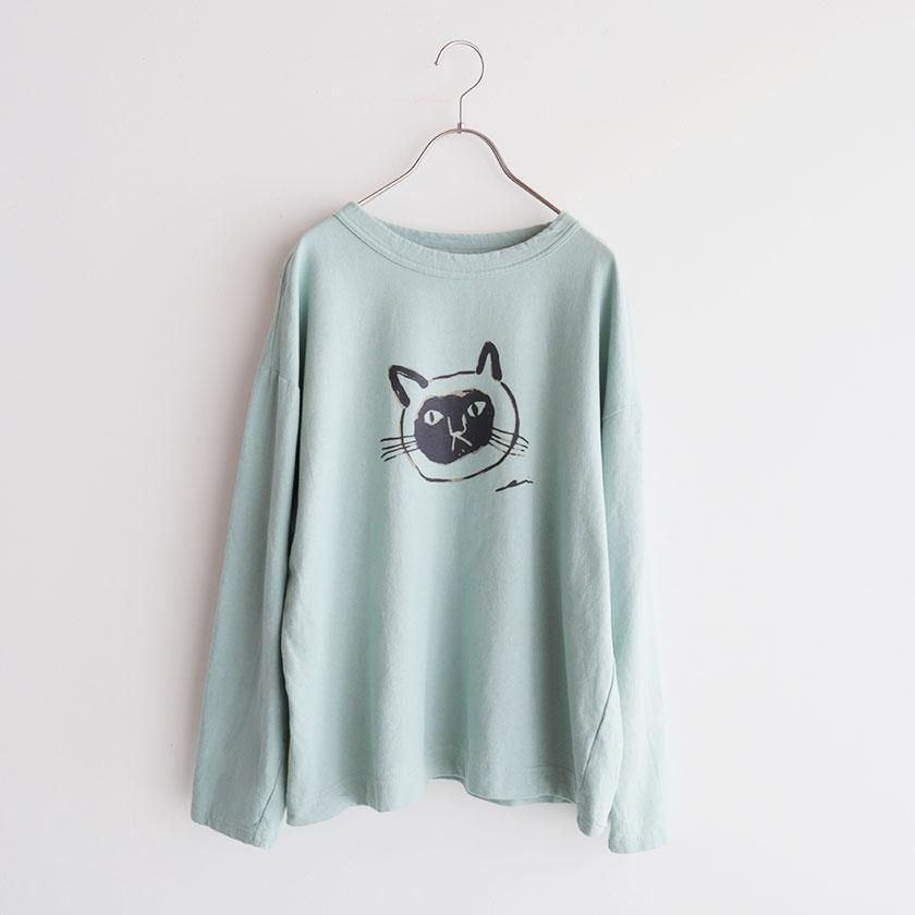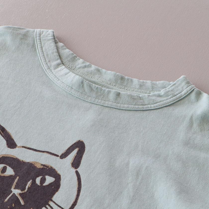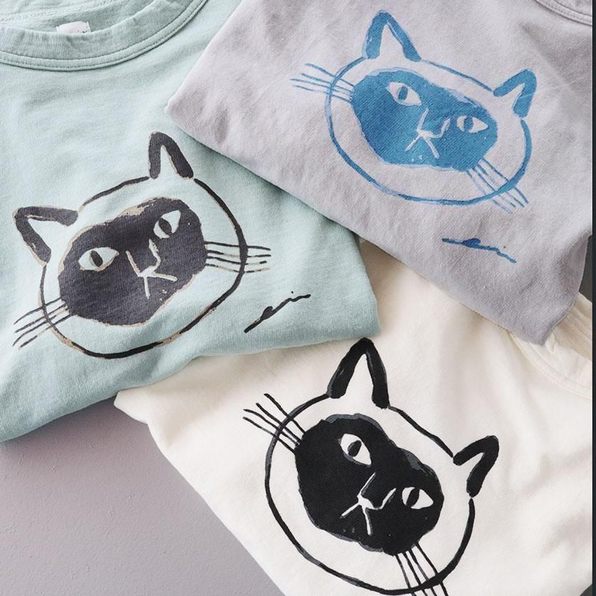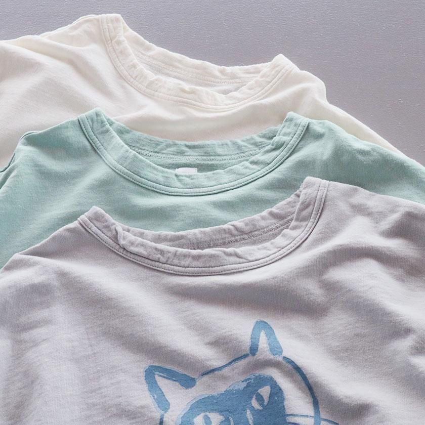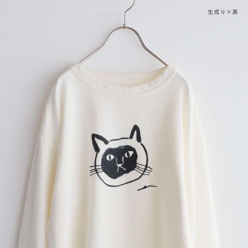 ほどよくゆとりを持たせたスタンダードシルエット。ボートネックのように横に広く開いたネックラインと肩落ちのショルダーラインがこなれた雰囲気を与え、リラックス感のある着心地を実現しています。どこか大人びた表情のねこちゃんが印象的。単色で描かれているので派手になりすぎず、着こなしに馴染みやすい仕上がりになっています。