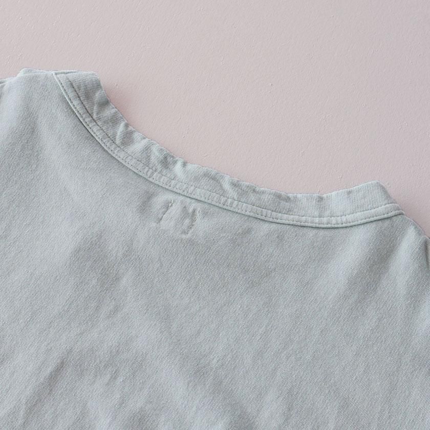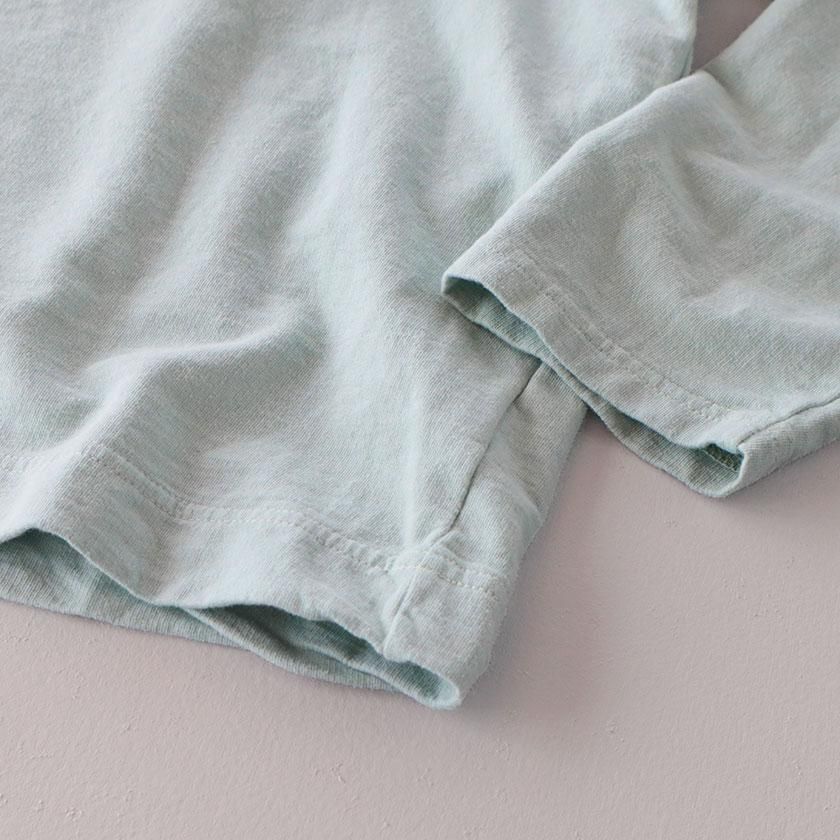生地にはホームスパン糸という優しい風合いの糸を使用。ベースとなる編み地の横方向に一本さらに糸を入れ込むインレイ編みにすることで、カットソーらしい着心地を残しつつ、生地にハリとコシを持たせています。表面は天竺のような生地感ですが、肌に当たる裏側はふっくらと柔らかな肌触りに。Tシャツ以上スウェット未満の絶妙な厚みも魅力の一つで、一枚着としてもインナーとしても大活躍してくれること間違いなしですよ。