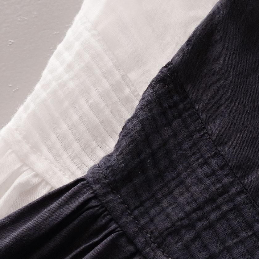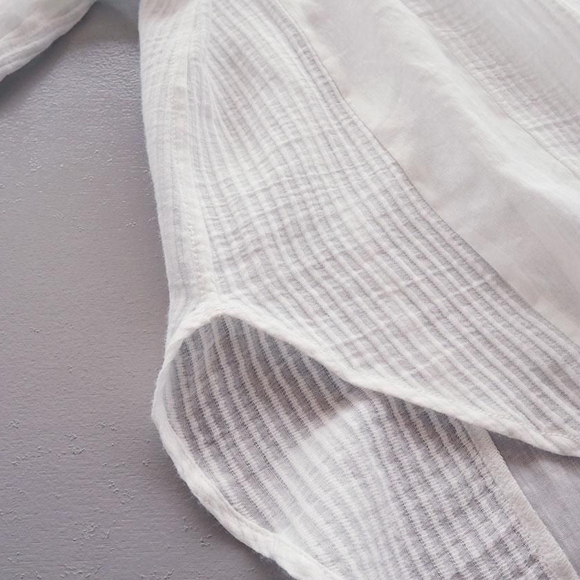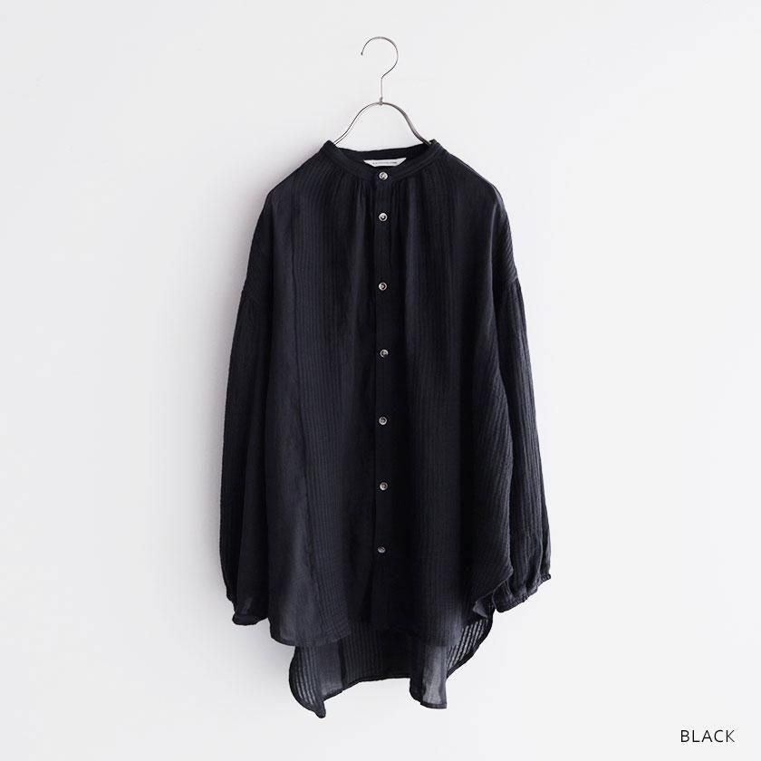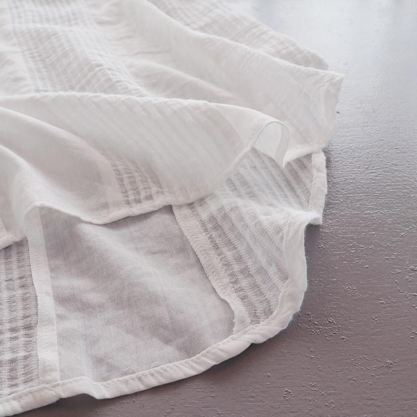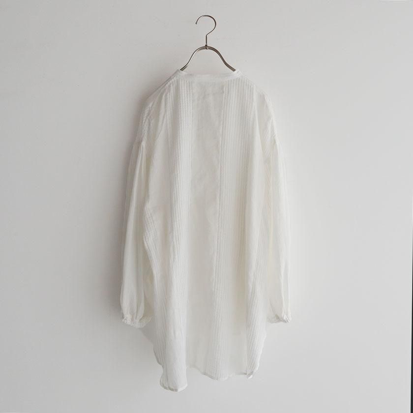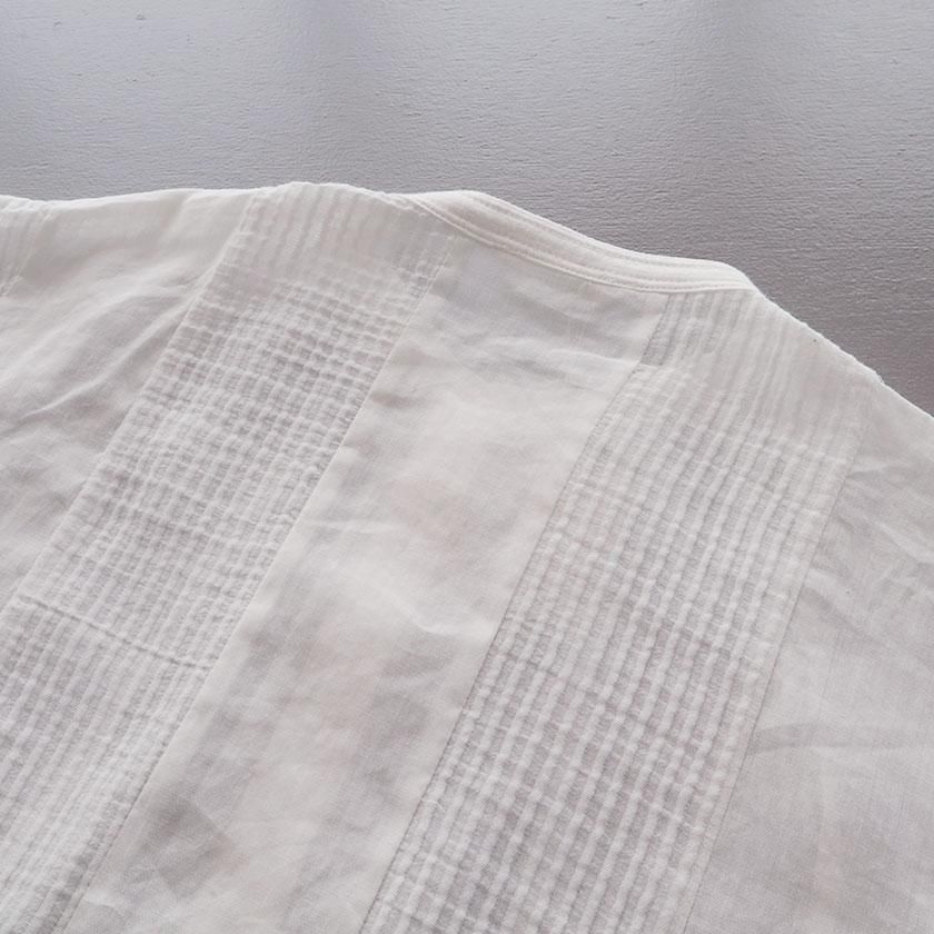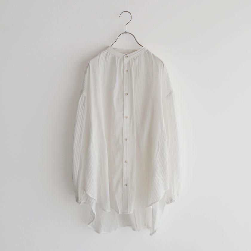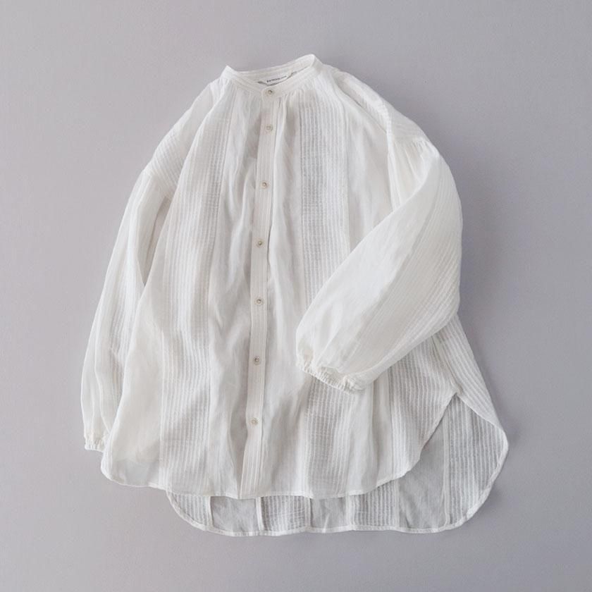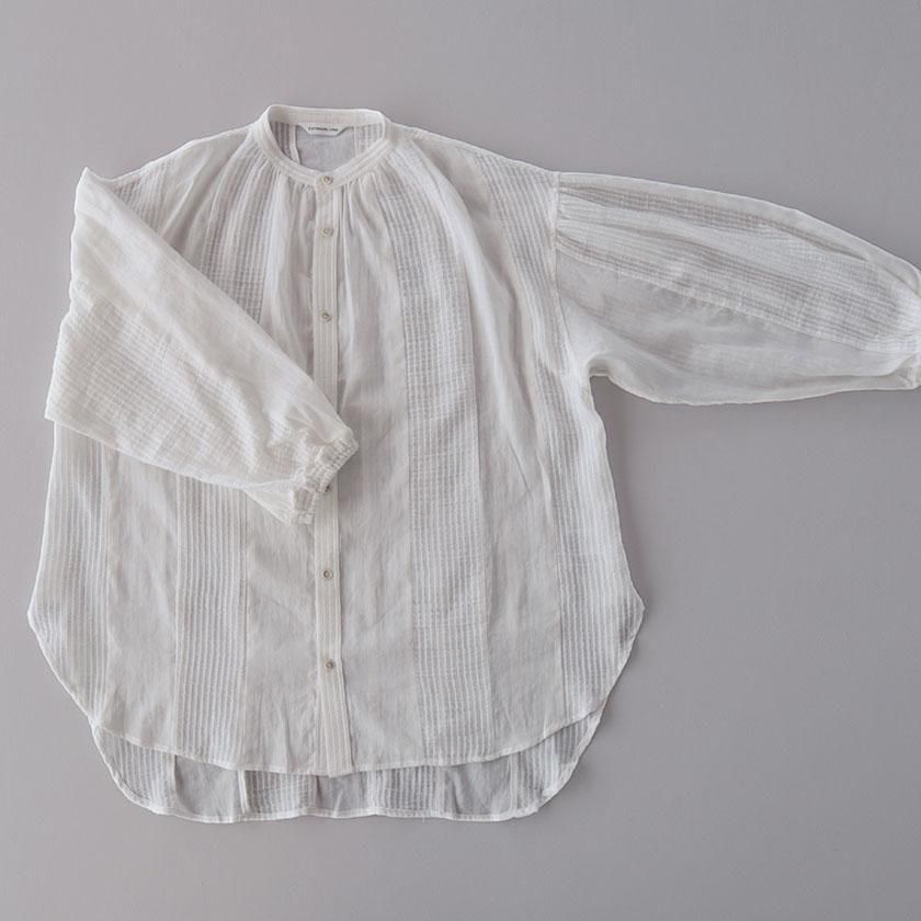 無地の部分には綿麻素材、ストライプ部分には綿100%素材を使用しています。柔らかく上品な透け感のある風合いと、ドビー織りによる独特の凹凸感が特徴。ストライプがさりげなく縦のラインを強調し、すっきりと爽やかな印象を与えます。