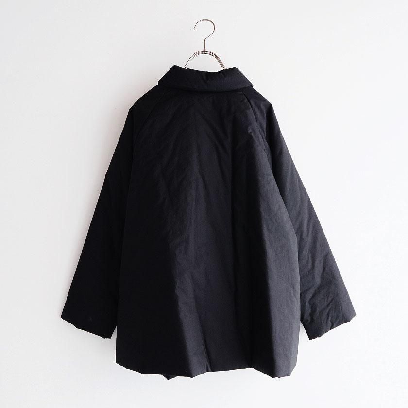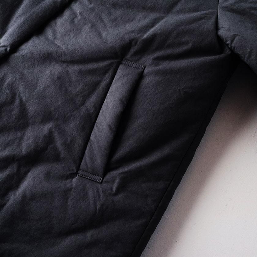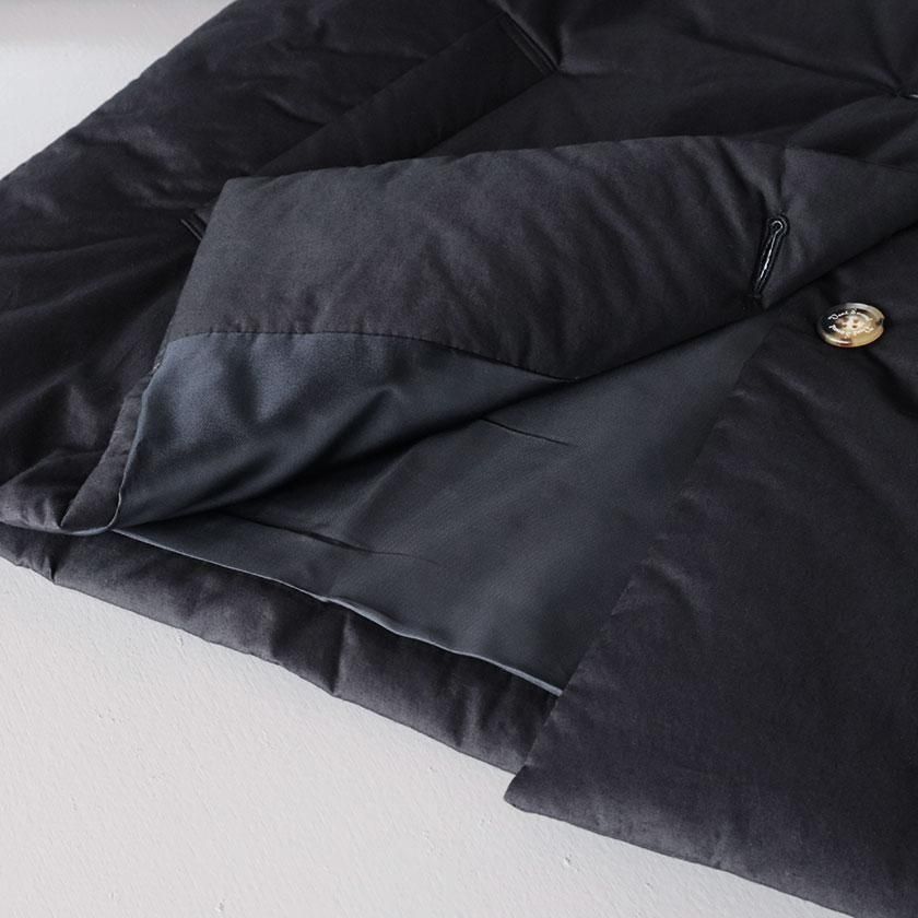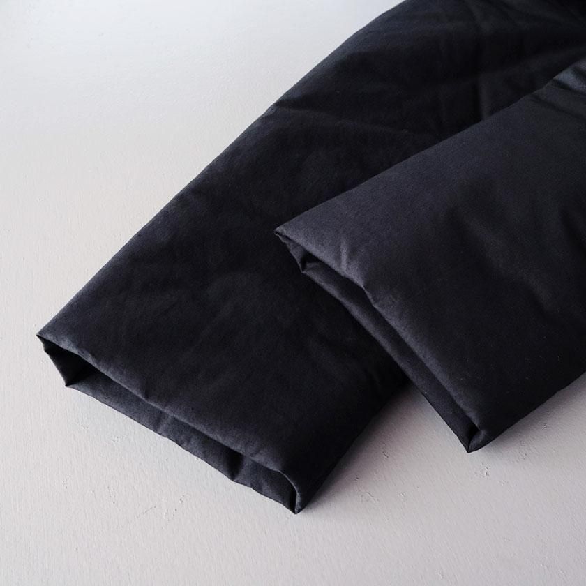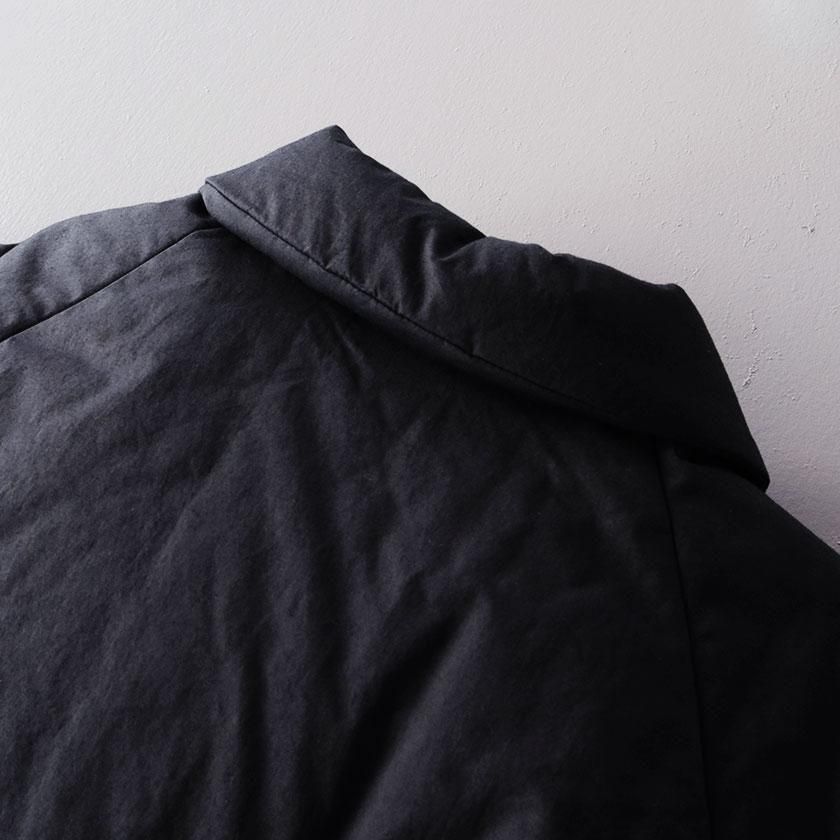 表地にはコットン100%のタイプライター生地使用。高密度に織り上げることで、ハリがありながらもしっとりとならかな肌触りの生地感を実現させています。濃淡のあるナチュラルな風合いも特徴の一つ。裏地には滑りのいいポリエステル素材を採用し、中綿を入れることで軽くてあたたかな着心地に仕上げています。