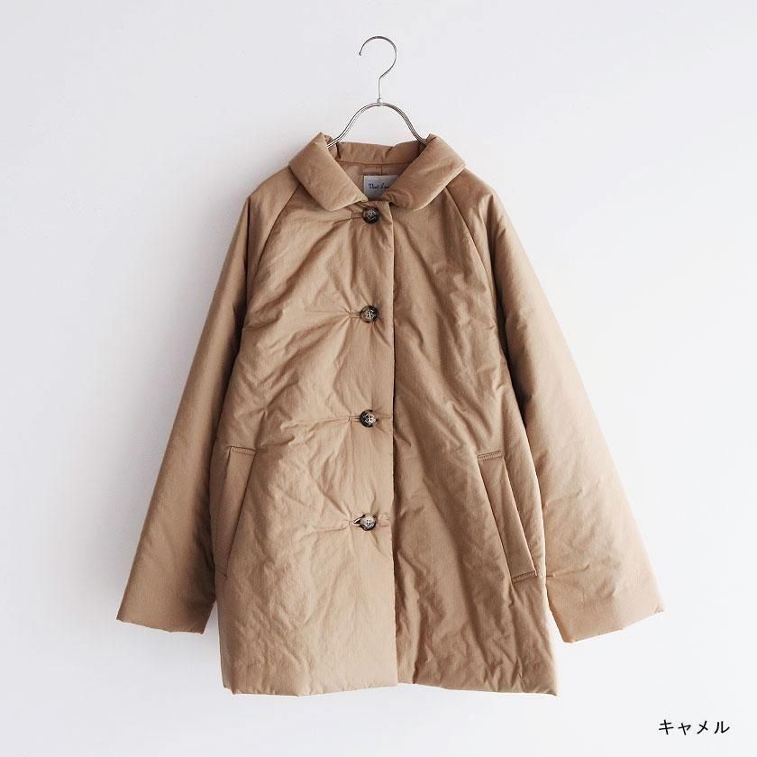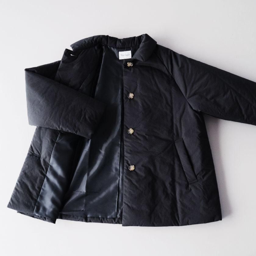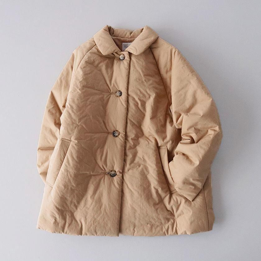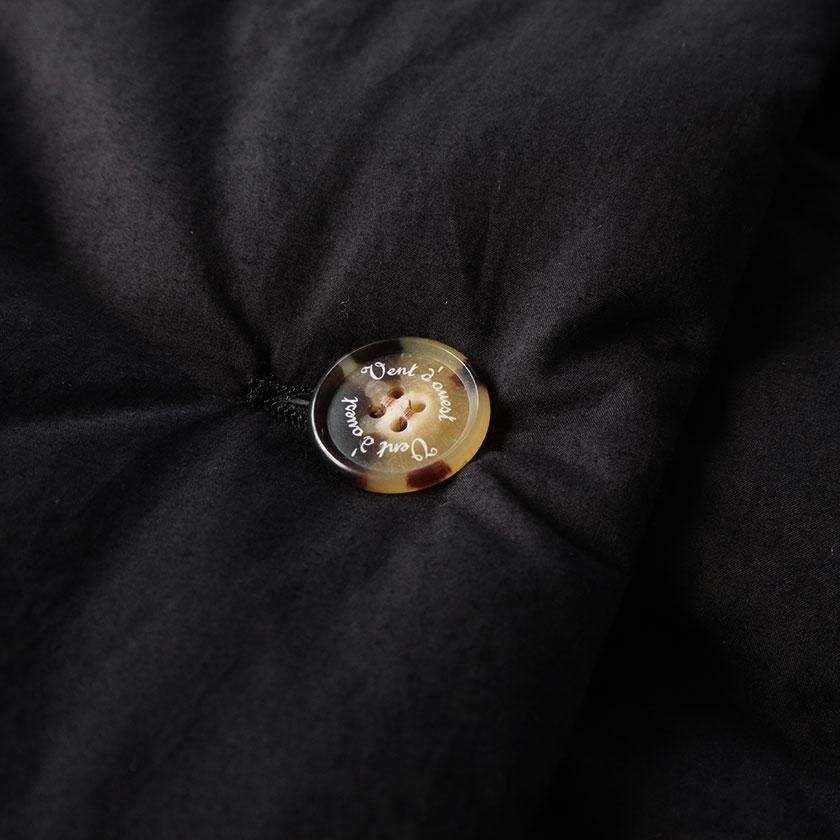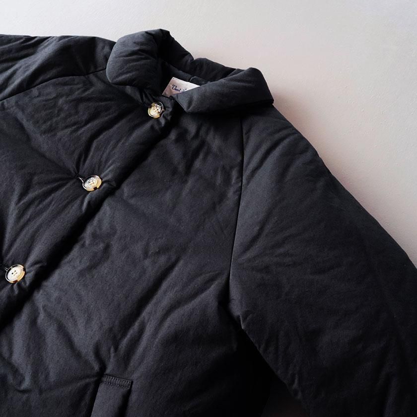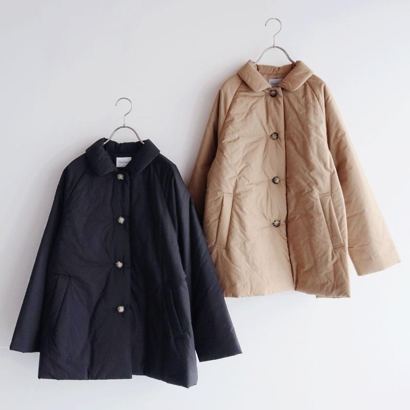 表地にはコットン100%のタイプライター生地使用。高密度に織り上げることで、ハリがありながらもしっとりとならかな肌触りの生地感を実現させています。濃淡のあるナチュラルな風合いも特徴の一つ。裏地には滑りのいいポリエステル素材を採用し、中綿を入れることで軽くてあたたかな着心地に仕上げています。