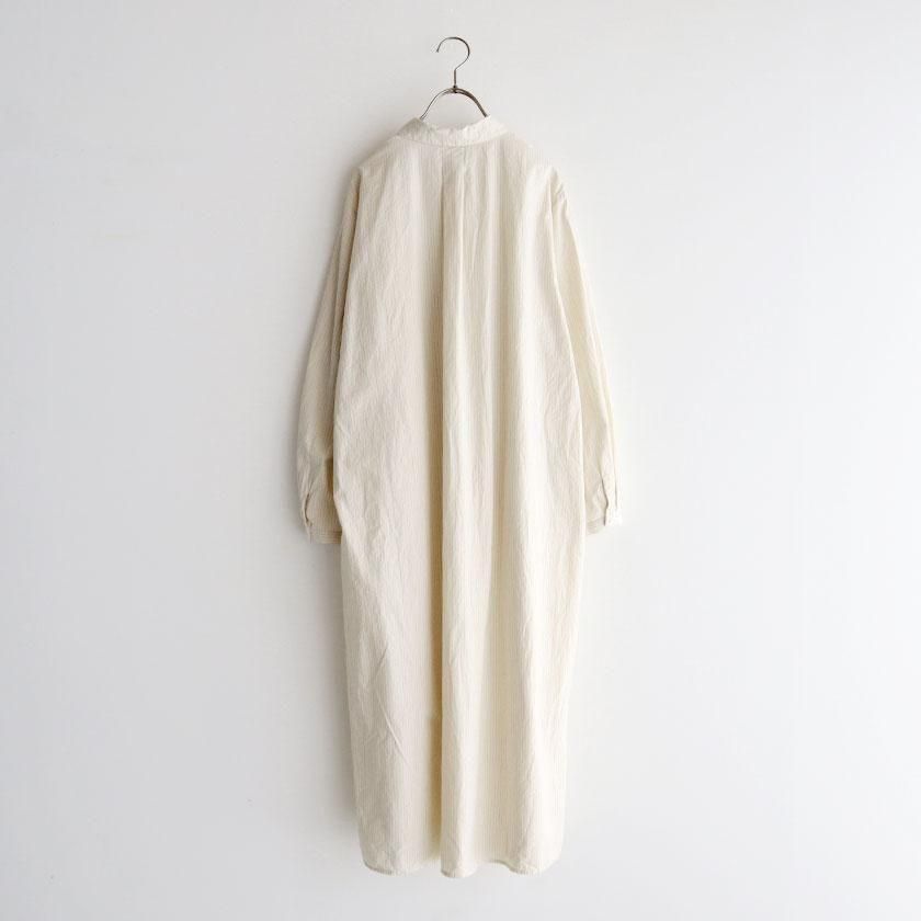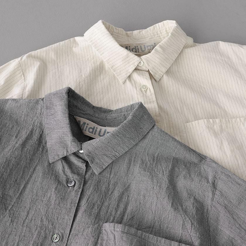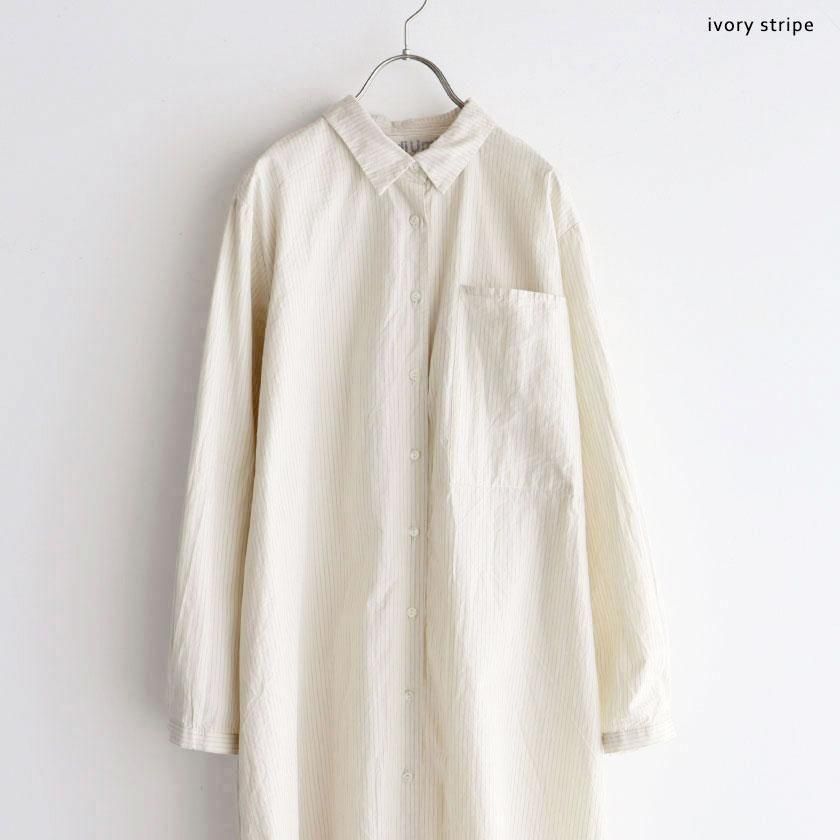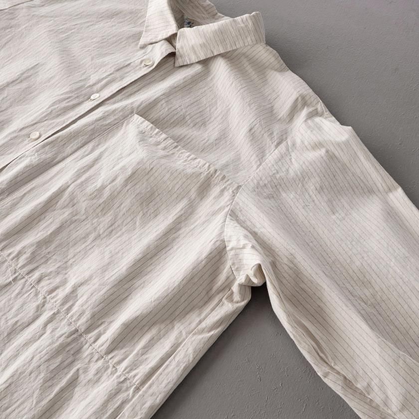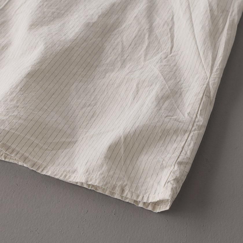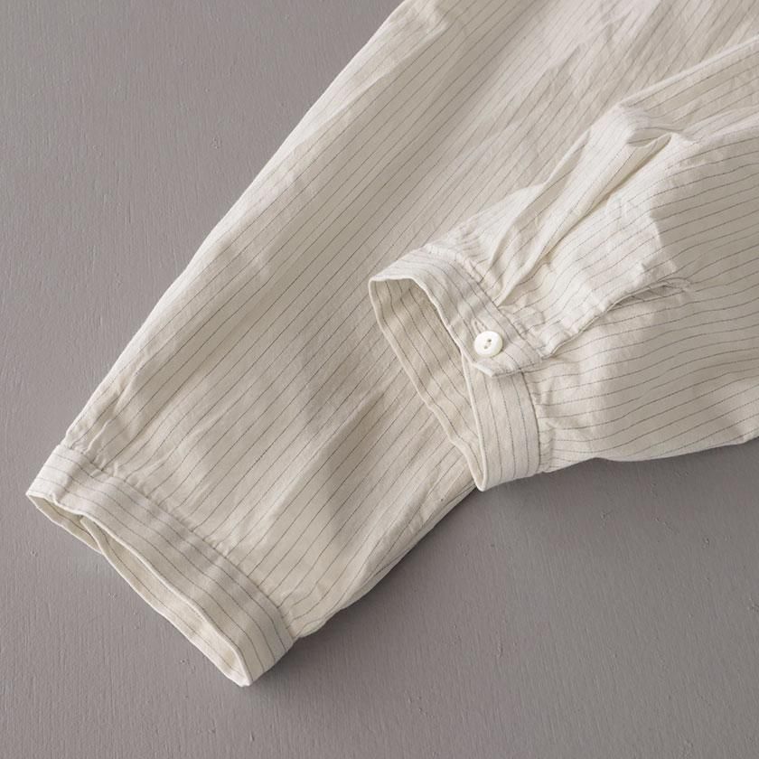 素材はやや薄手のブロード生地を使用。ハリのあるさらりとしたドライな質感が特徴で、シーズン問わず快適にご着用いただけます。ほどよいシワ感とナチュラルな風合いも魅力の一つ。一枚でのご着用はもちろん、パンツに重ねたり、羽織りとして使ったりと様々な着こなしを楽しめる一着です。