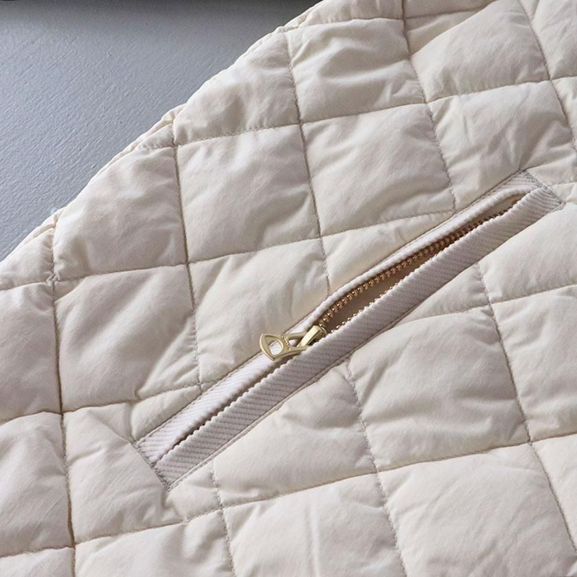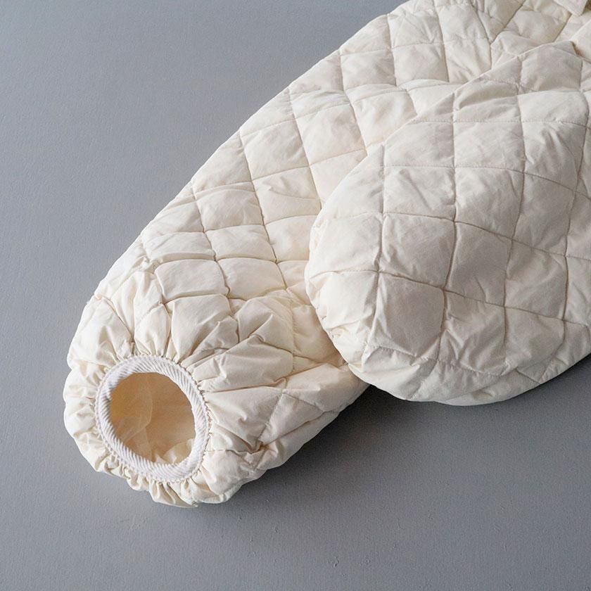 ※ダウン製品の構造上、生地目および縫い目から中の羽毛が飛び出す場合があります。羽毛が出てきている時は無理に抜き取らず裏から内側に戻してください。
