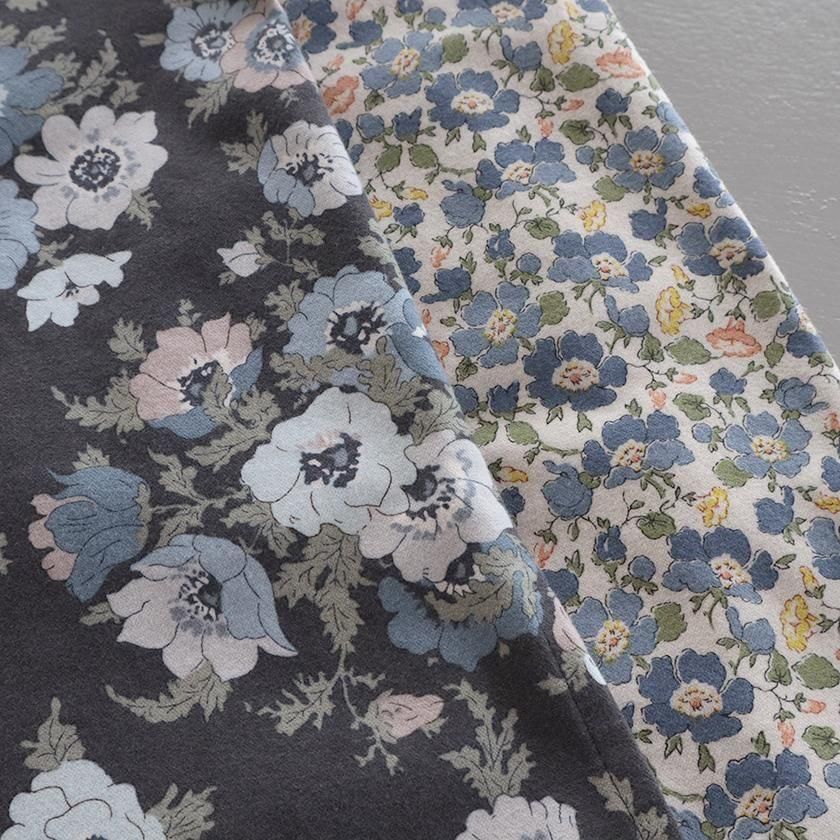 綿素材の両面に弱い起毛加工を施した生地は、なめらかな肌触りと優れた保温性が特徴。ほどよく肉厚ながらも軽やかな着心地で、見た目にもあたたかな生地感が魅力です。カラーによって異なるプリントデザインを採用しており、落ち着いた柄と配色にすることで秋冬らしい穏やかな雰囲気に仕上げています。