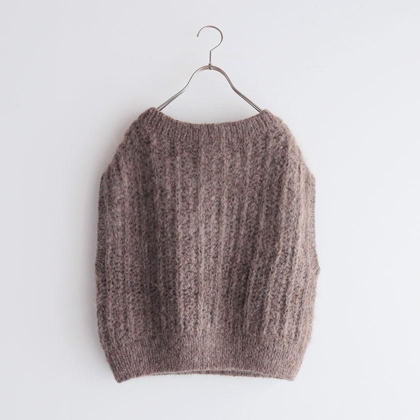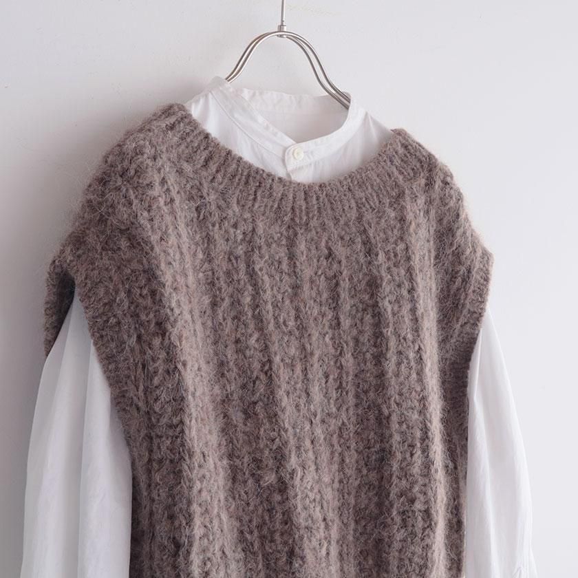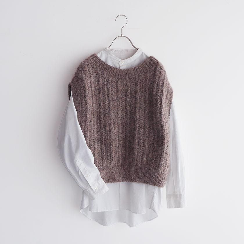腰にかかるほどのややコンパクトな着丈は、ゆとりがありながらもすっきりとした印象に。肩先を落としたゆるめのシルエットはフレンチスリーブのように自然と肩に沿い、肩周りもあたたかく包み込んでくれます。アームホールが広めなので、袖にボリュームのあるトップスとのレイヤードも楽しめますよ。ブラウスやワンピースに重ねるだけで、冬の装いをぐっと上品に演出します。