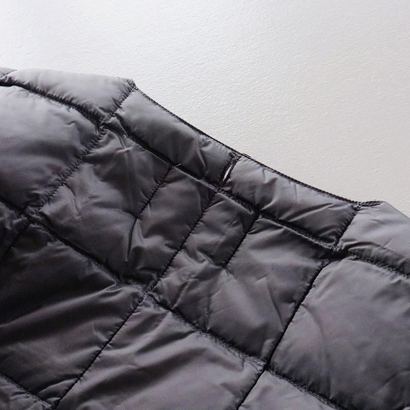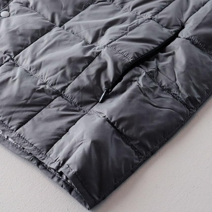 ほどよく体にフィットするサイズ感。ジャケットやコートの下に着用するのはもちろん、シャツやパーカーの上からでも軽やかに羽織っていただけます。首元はタートルネックなどと相性のいいクルーネックに。前立てには着脱しやすいYKKプランサーボタンを採用したり、風が入りにくいようアームホールにストレッチパイピングテープを施したり、ミニマルなデザインと優れた機能性を両立させた仕上がりになっています。両脇にはあると便利なファスナーポケット付き。専用袋が付属しておりコンパクトに収納できるので、おでかけや旅行時などの持ち運びにも便利ですよ。