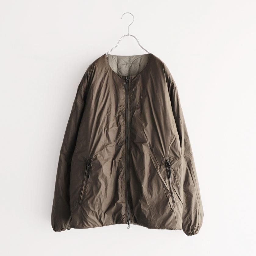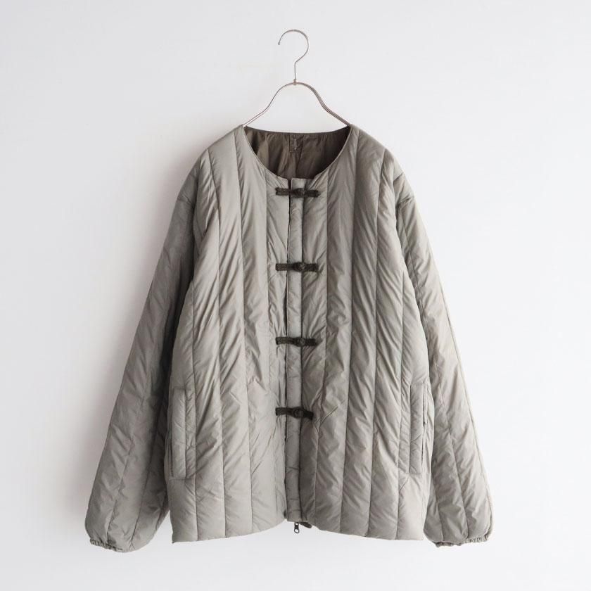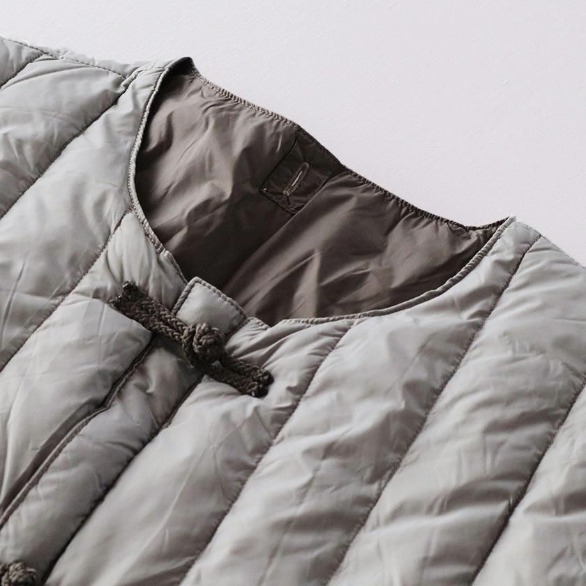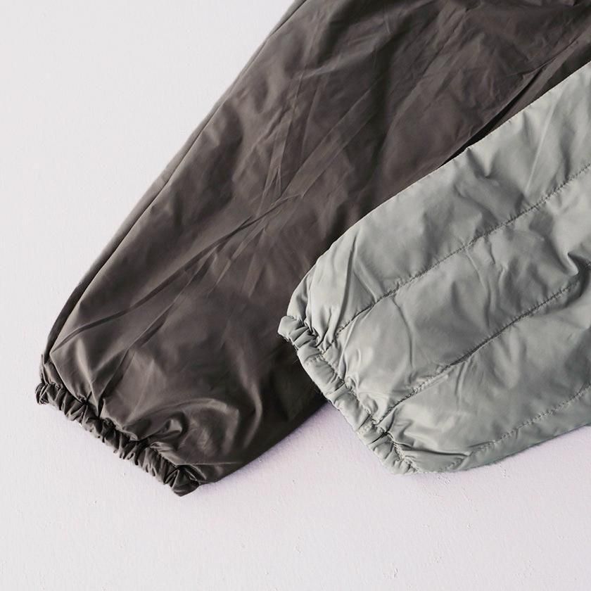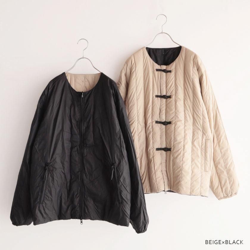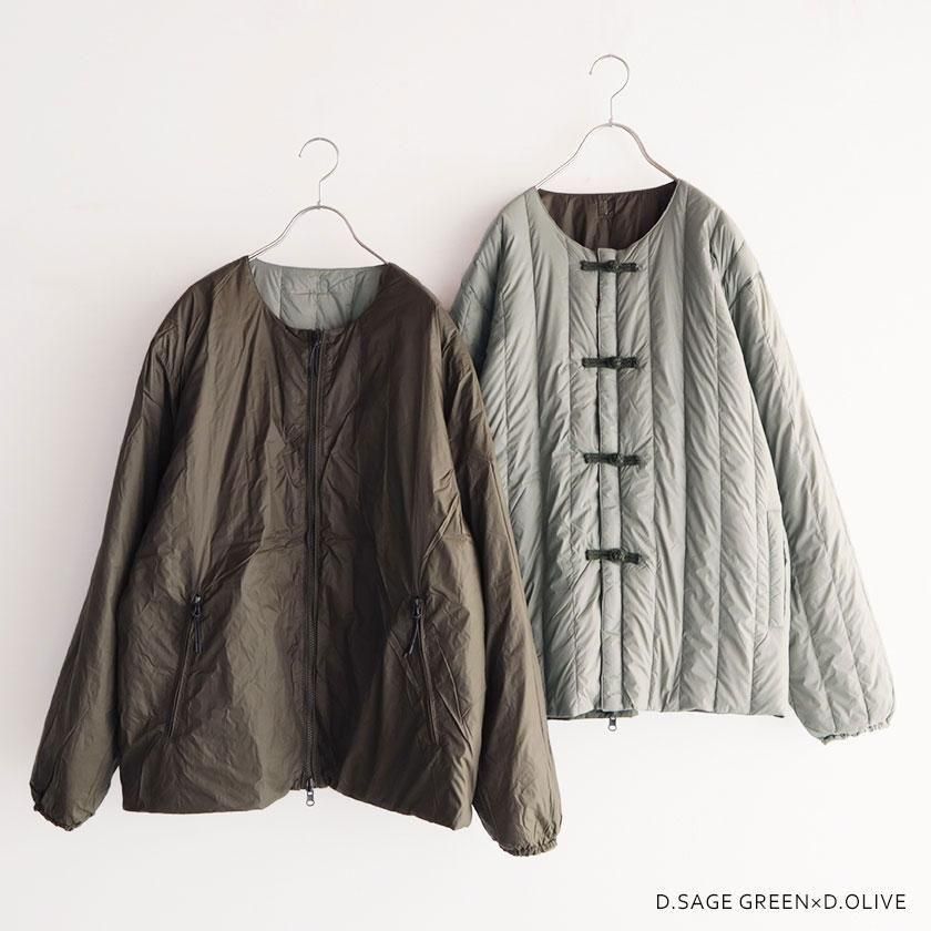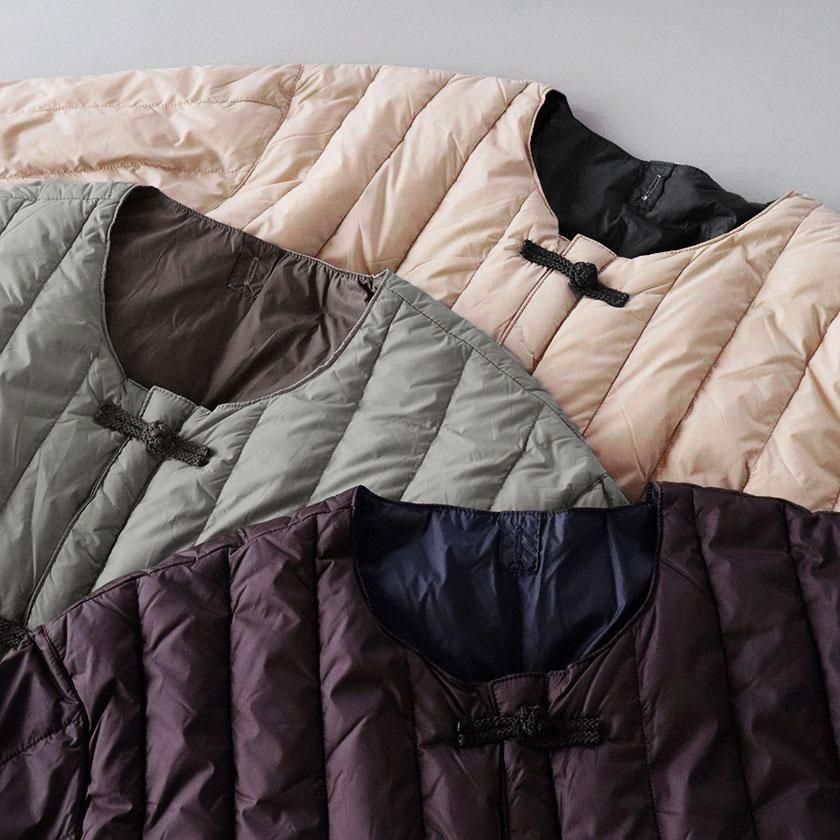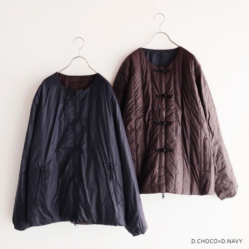 気分やコーディネートに合わせて楽しめるリバーシブル仕様。表側はすっきりとした縦キルトに、個性的なチャイナボタンの前立てが特徴的。裏側はキルトやステッチのない洗練された表情に。ミニマルな見た目にジップポケットがアクセントになっています。ほどよくゆとりを持たせたリラックス感のあるシルエット。首元はクリーンな印象のクルーネックでタートルネックやマフラーなどと相性抜群◎専用袋が付属しておりコンパクトに収納できるので、旅行時やレジャーシーンにも重宝しますよ。