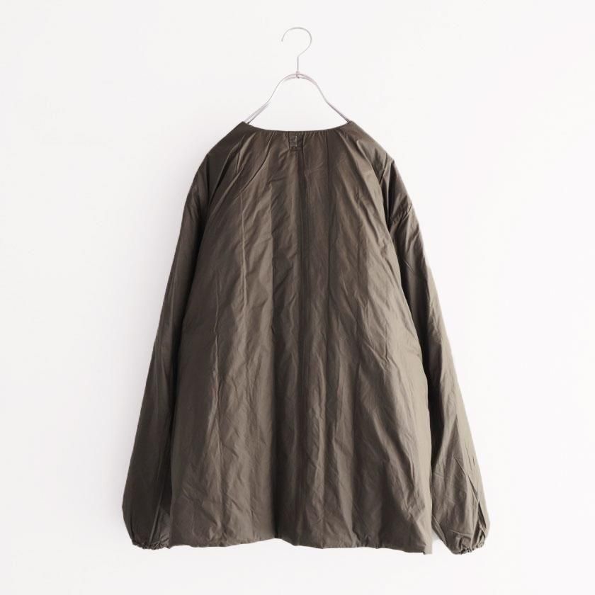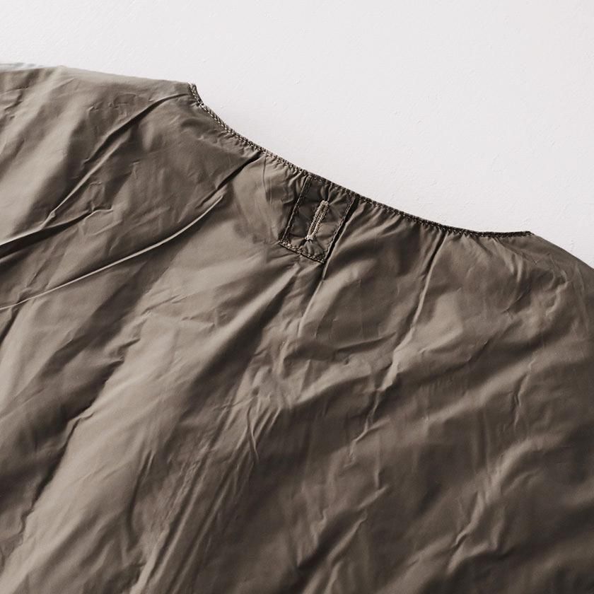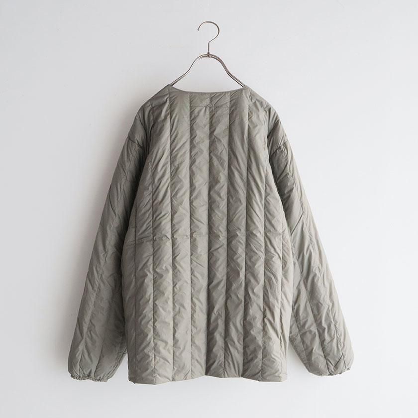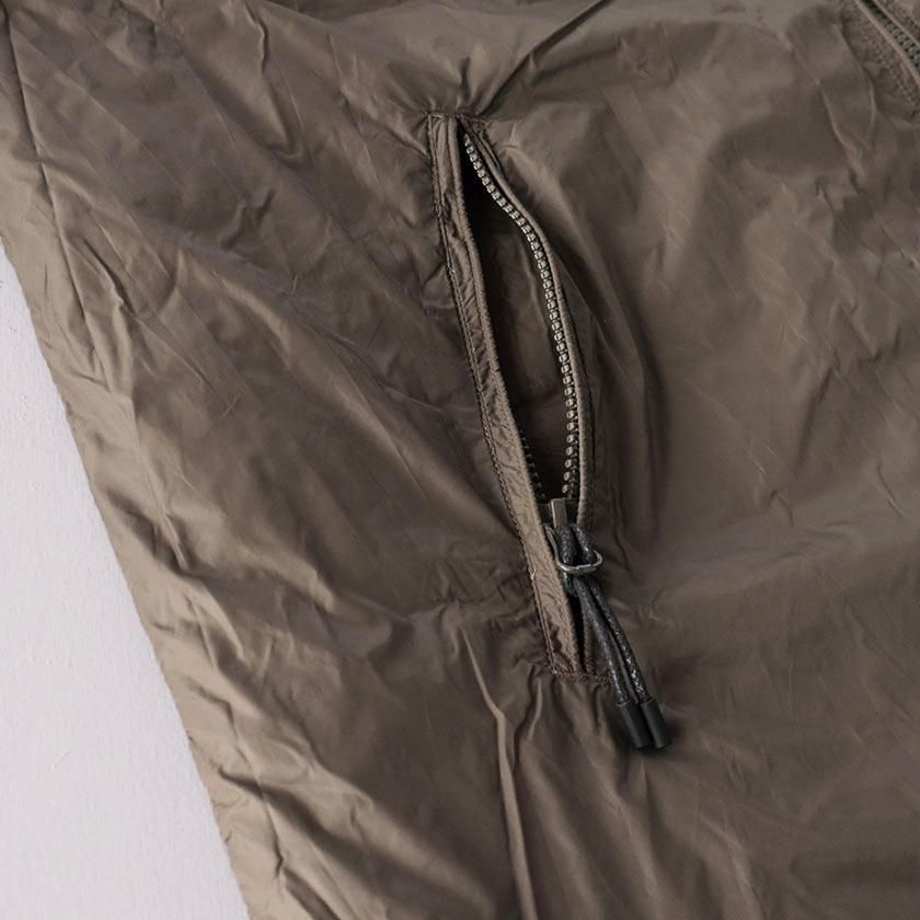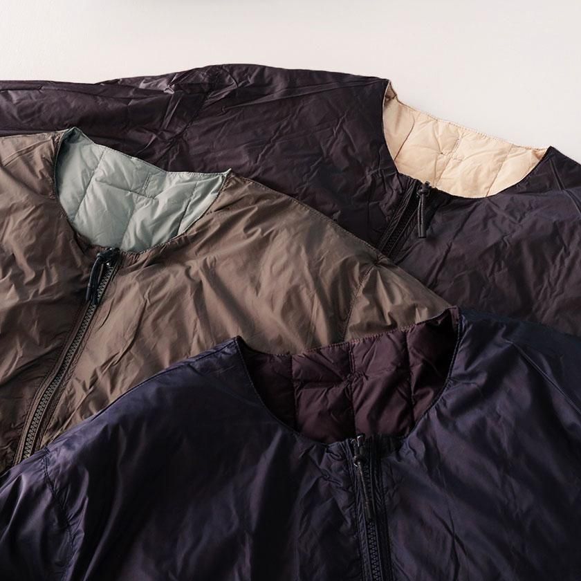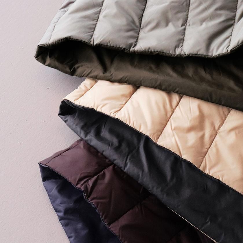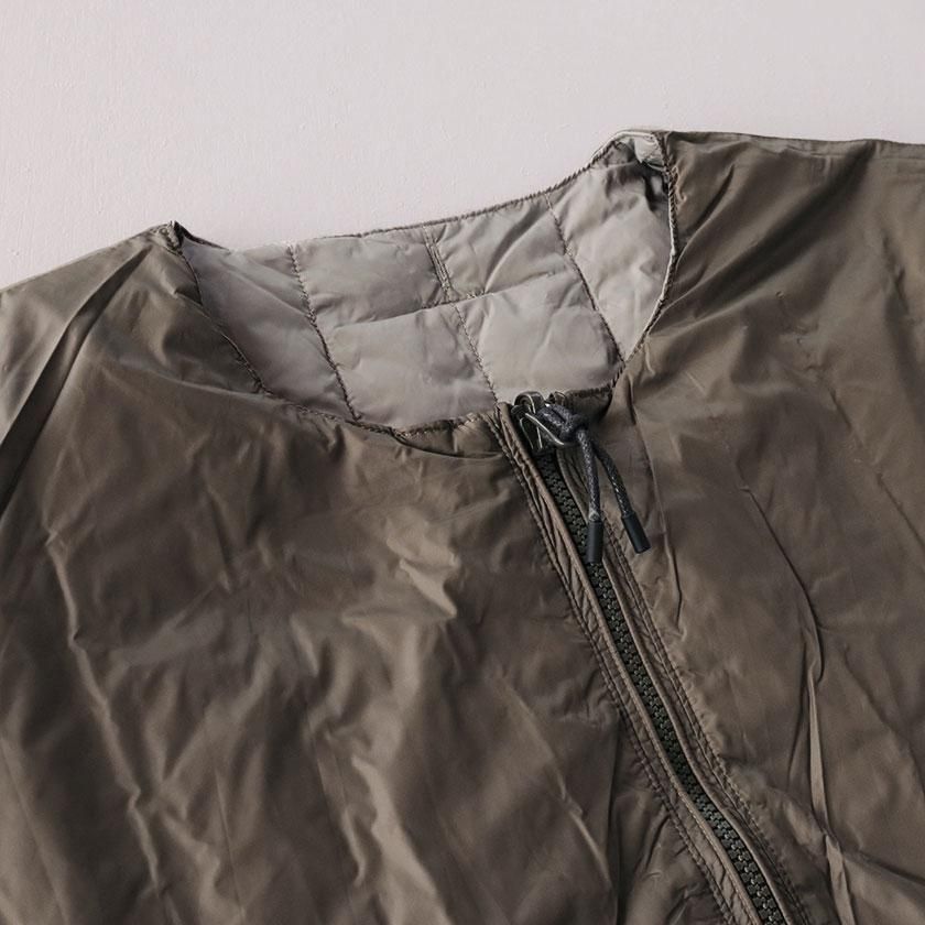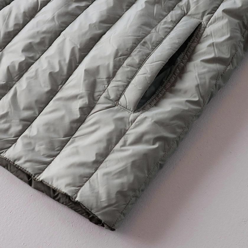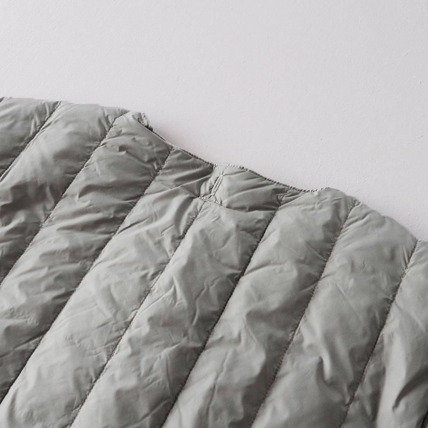素材には軽度の雨をはじいたり、汚れをつきにくくする撥水加工をかけた高密度ナイロン生地を使用。中綿には高品質な800フィルパワーのダウンを採用し、ダウン専用糸で縫製することでダウンの吹き出しを最小限に抑えています。一般で使用されるダウンよりも空気を多く含むため、羽毛がふっくらと大きく膨らみ、薄手ながらもしっかりと暖かいのが特徴。柔らかく軽やかな着心地を実現させています。