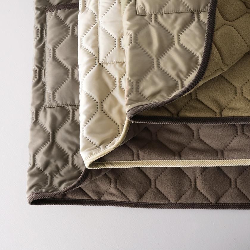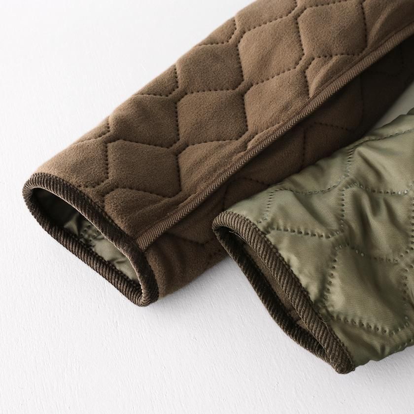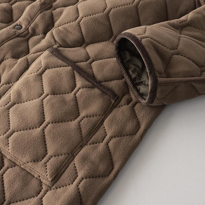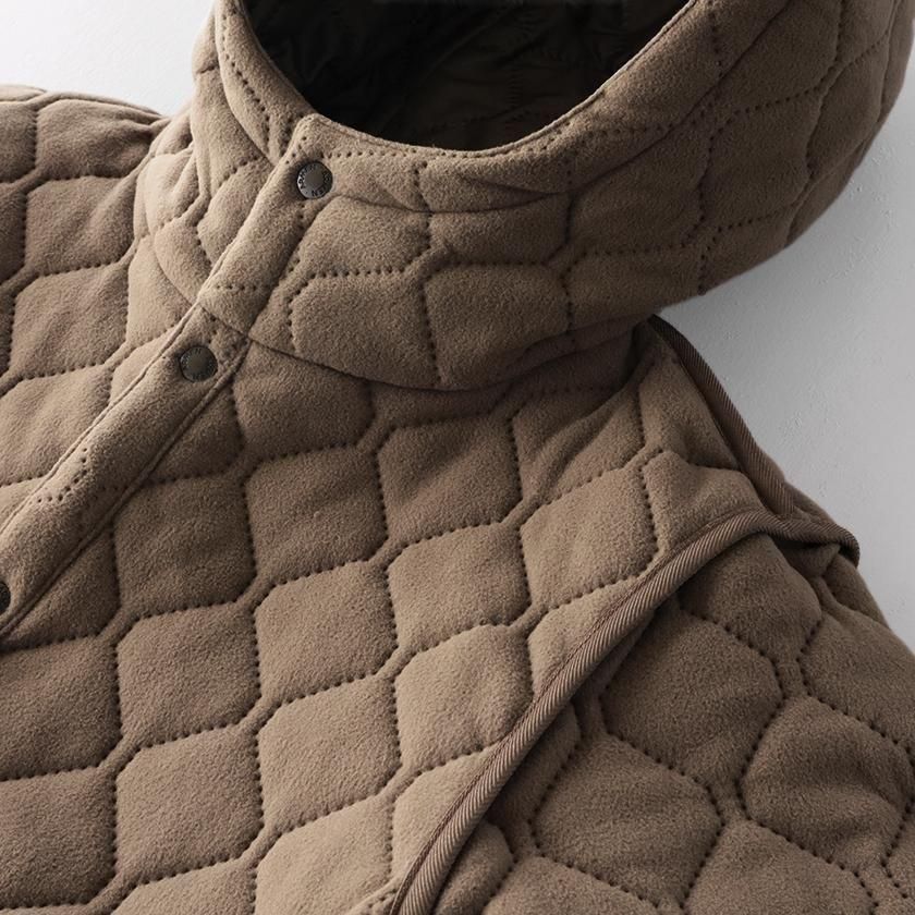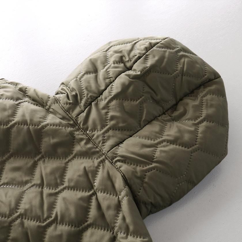 表地は上品な光沢感のあるポリエステル素材を、裏地には滑らかな肌触りが心地いいフリース素材を使用しています。ステッチを使わずに表地と裏地を熱と超音波の力で圧着しているのでキルティング生地で起こりやすい、糸が切れるという心配かないのがヒートキルトの特徴。厚みを抑えながらもしっかりと暖かく、すっきりと軽い着心地を実現させています。