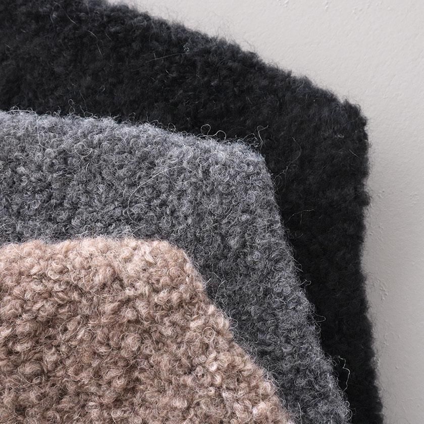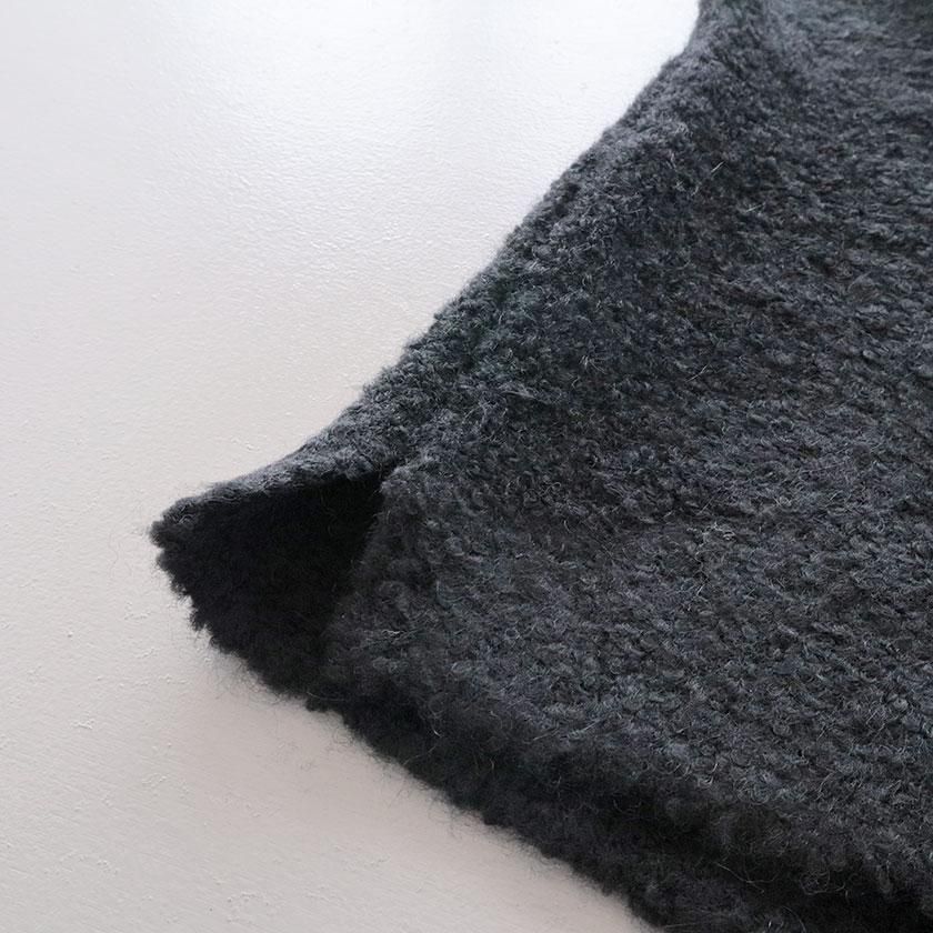 イタリー糸を用いた表情豊かなブークレ素材を使用しています。スーパーファインアルパカ、ウール、アクリルのブークレヤーンをストレッチ糸で撚糸。ループ状の糸が生み出すモコモコとしたボリュームとあたたかみのある風合いが特徴で、柔らかさと保温性を兼ね備えています。