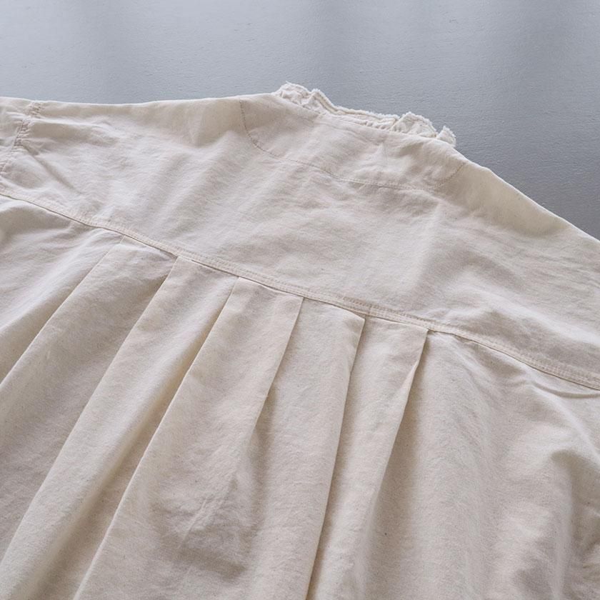 ゆったりとした身幅に、後ろはヒップが隠れるくらいの長さがあるのでリラックスして着用できます。首回りとフロントにあしらわれたフリルや両サイドのスリットが印象的なデザインで、一枚でサマになりますよ。背中側はタックからふんわりと広がる立体的なシルエットに。袖口に入ったステッチや、裁ち切りデザインのフリルなど細部まで表情豊かな一着です。