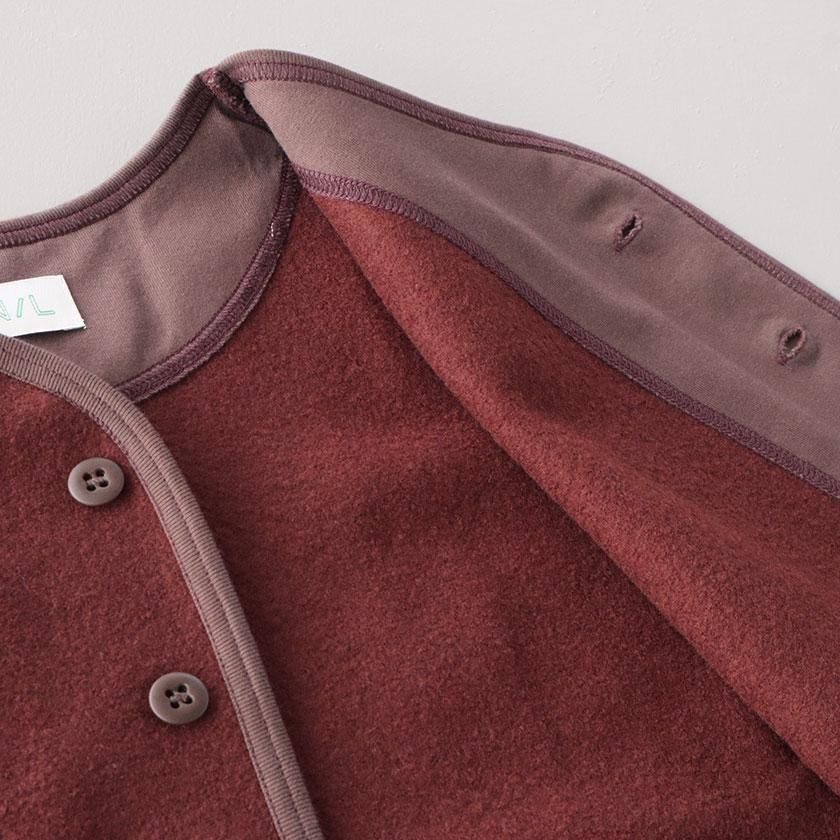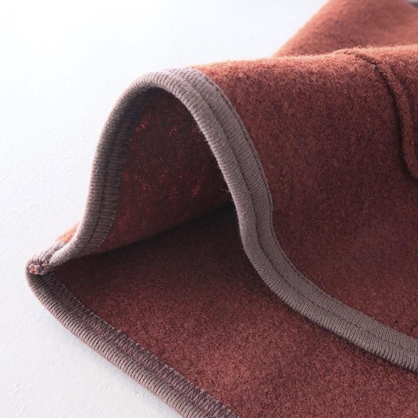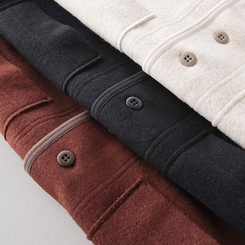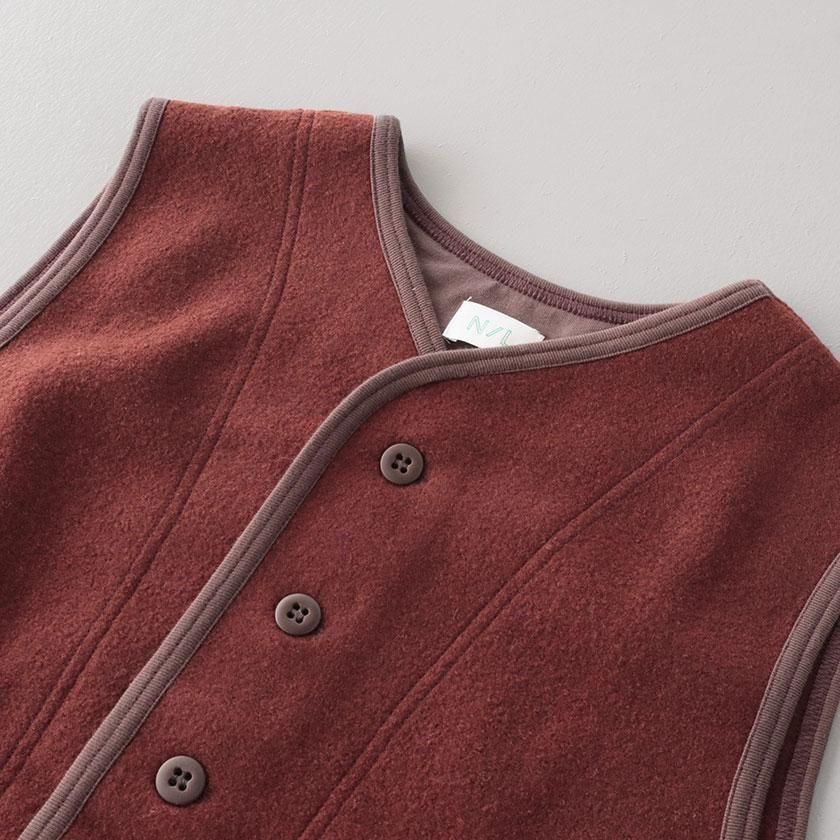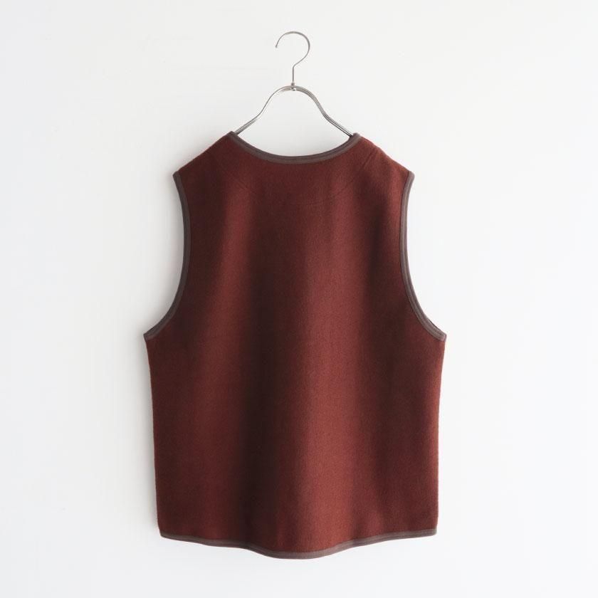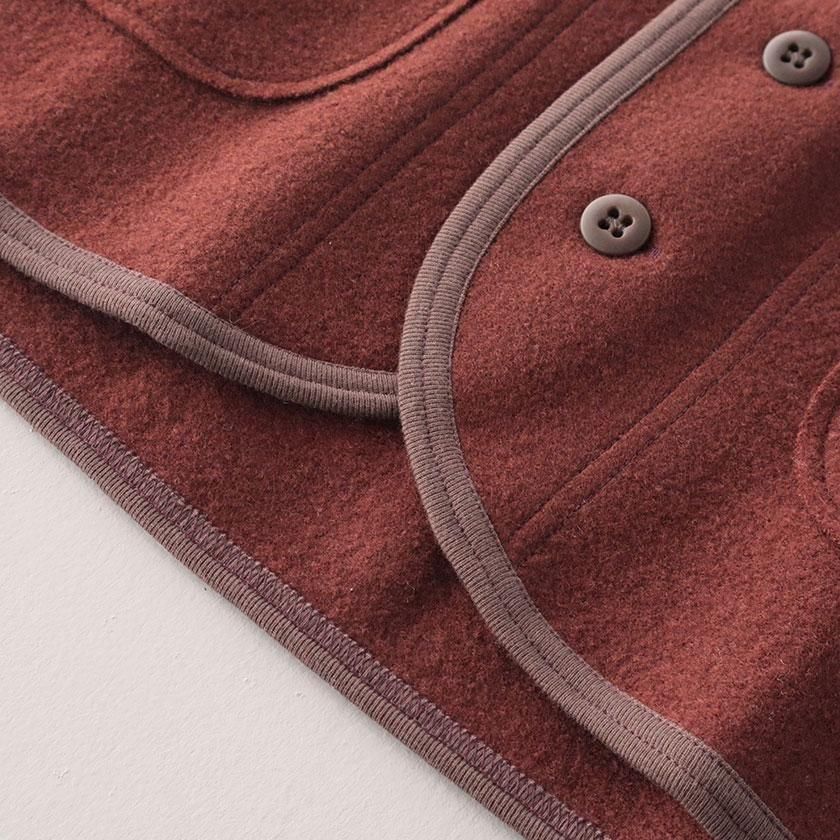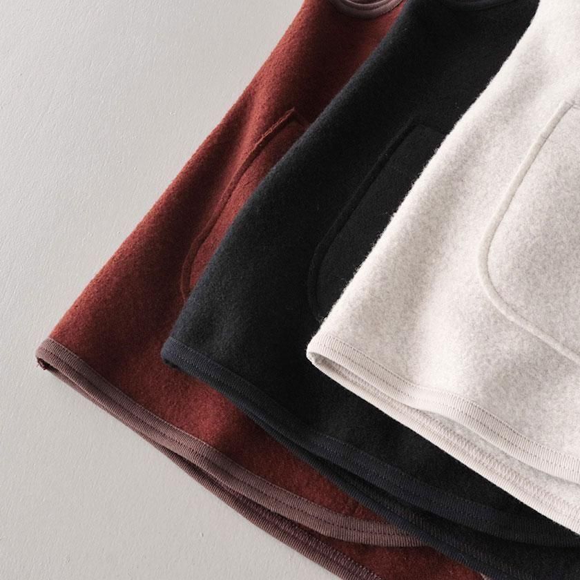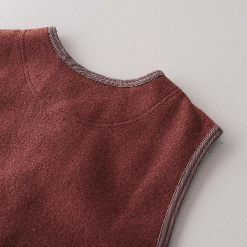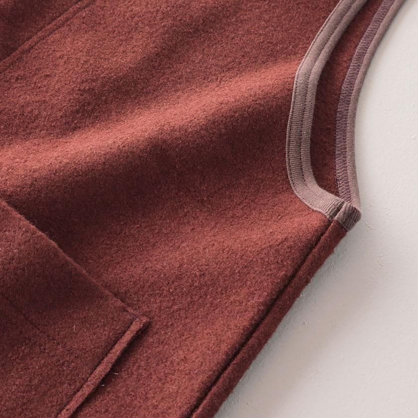 生地に使用しているのはふっくらとしたフェルトのような質感のウールリング。密に編まれたパイル編みが空気をたくさん含むため、保温性に優れているのが特徴です。ウール特有のチクチクとした肌触りも気になりにくく、包み込まれるようなリラックスした着心地。重たいアイテムが多くなりがちな冬にも肩の凝らない軽やかさが嬉しいベストです。
