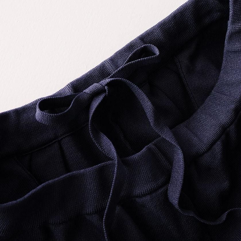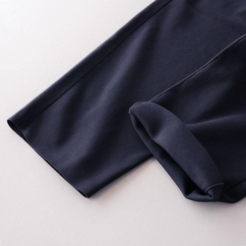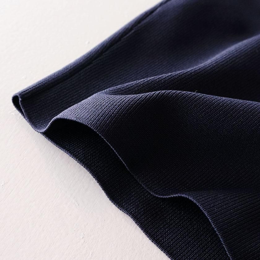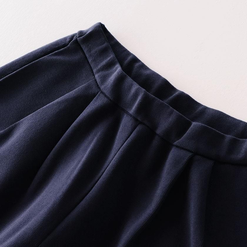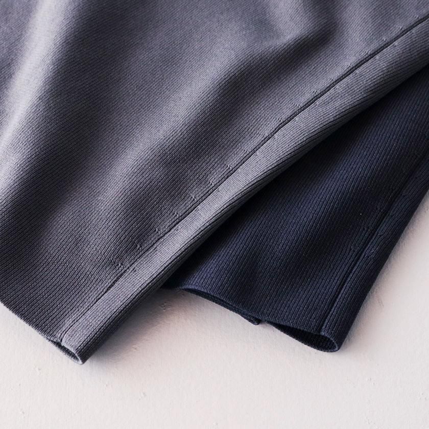 ポリエステル100%の糸を使用したミラノリブは柔らかな光沢とややかためのしっかりとした生地感が特徴。目の詰まった編地が美しく、フラットに見えるためカジュアルになりすぎず洗練された雰囲気を演出します。ほどよいハリとストレッチ性があることで快適な穿き心地を実現。ご家庭で洗えるのも嬉しいポイントで、型崩れしにくく、きれいなシルエットを保てるので日常に取り入れやすい一着です。