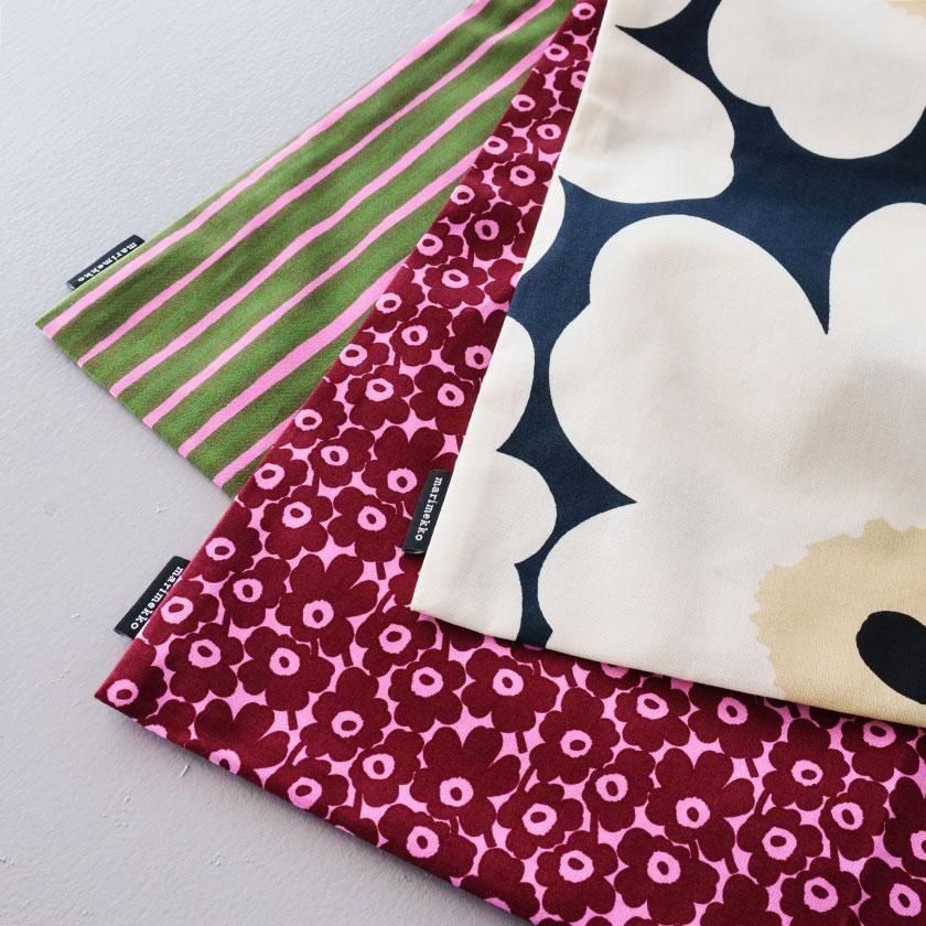 ブランドを代表するケシの花をモチーフにしたUnikko (ウニッコ)柄と、ビビッドなストライプ柄が目を惹く Piccolo(ピッコロ)柄の生地を使用。コットン100%のさらりとした質感でシーズン問わずご使用いただけます。
