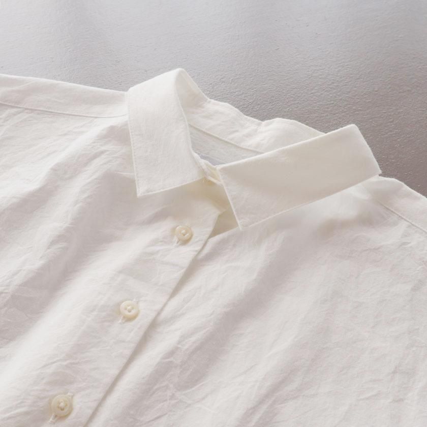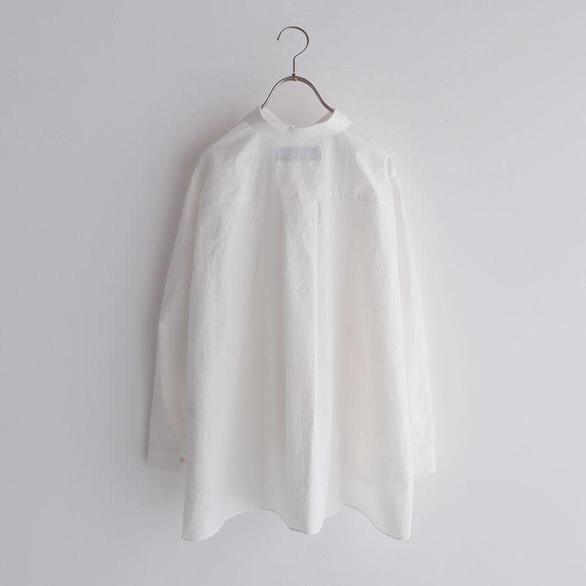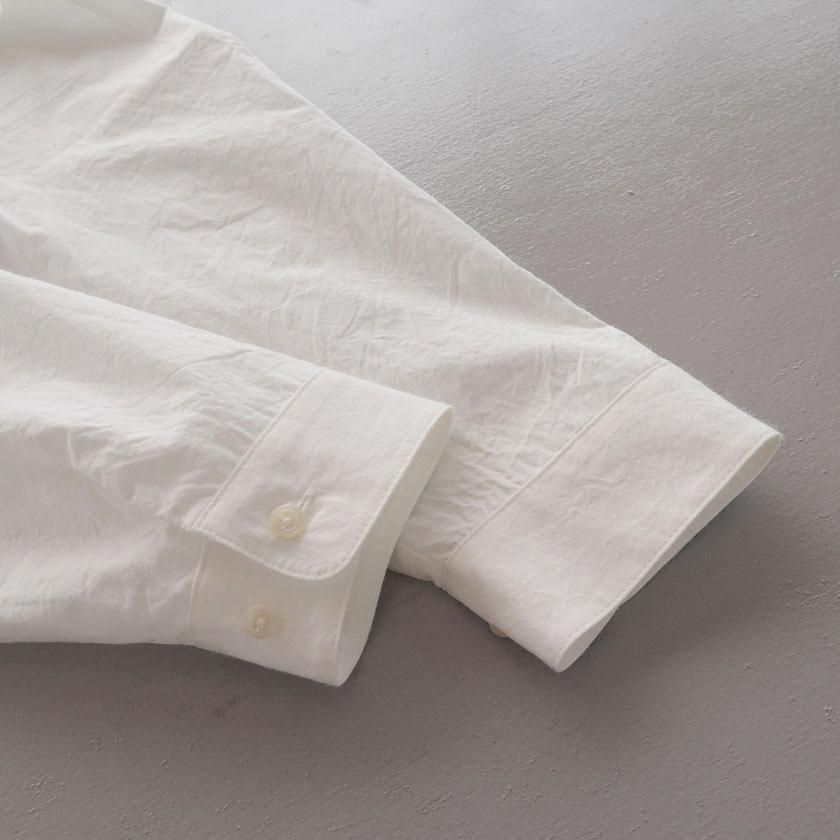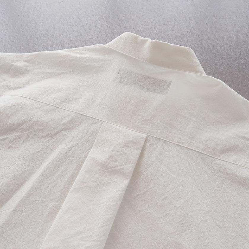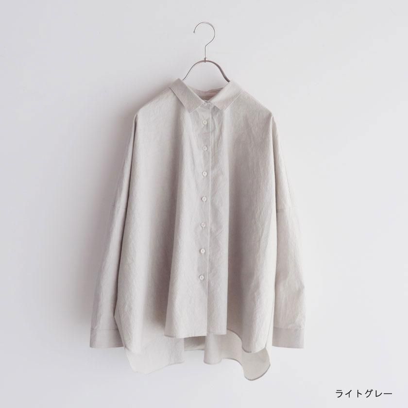 ゆったりワイドな身幅と深く落としたドロップショルダーが特徴的。襟はきちんと感を演出するレギュラーカラーにすることで全体のバランスを整えています。前後差のある着丈は前はすっきり、後ろはタックを入れてふんわりと広がるシルエットに。一枚で着ても、羽織りとしてもサマになる絶妙なサイジングが洗練された印象を与えます。