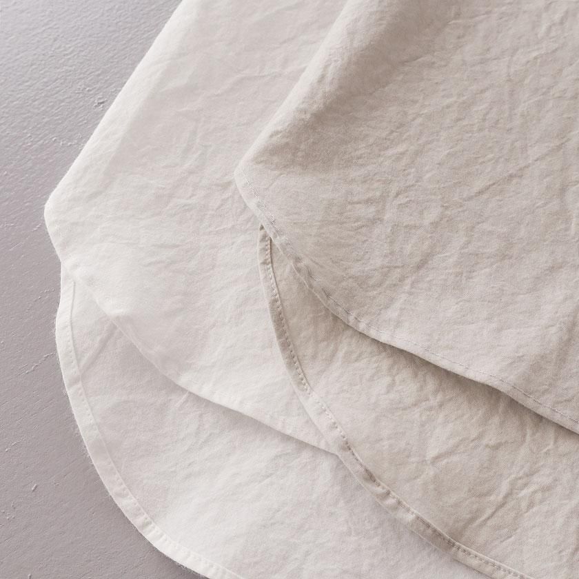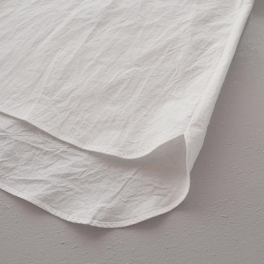 ほどよいハリ感とナチュラルなシワが魅力の40/1コットン素材を使用。遠州地区特有の強風とたっぷりの日差しを受けて仕上げた高密度生地は乾いたタッチが心地よく、天日干しならではの豊かな表情が感じられます。手作業に近い染色方法のためランダムに現れる染ムラや独特なかみなりジワも魅力の一つ。無地でありながらも奥行きのある上質な質感に仕上がっています。