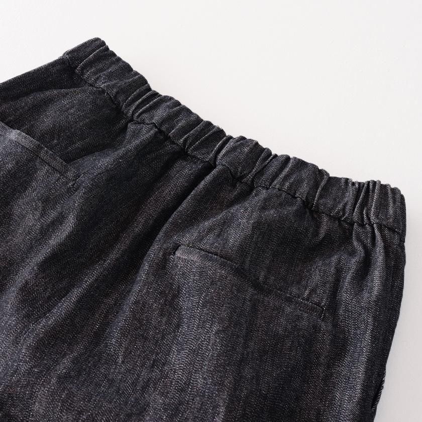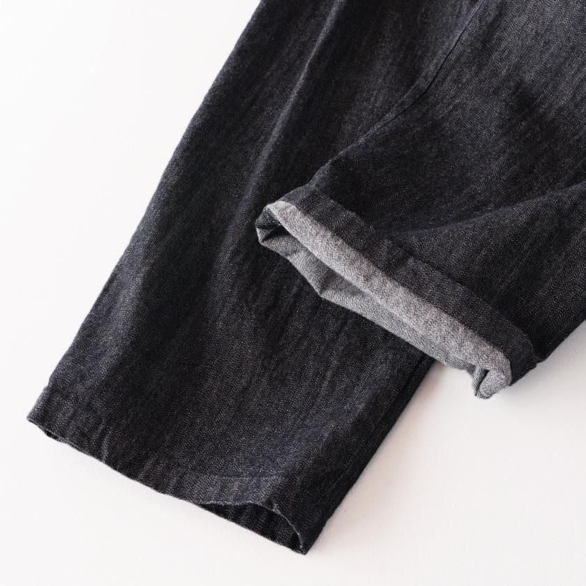 生地には10ozのムラ糸デニムを使用しています。ムラ糸ならではの味わいのある風合いと、着用を繰り返すうちに生まれる色落ちやアタリなどの表情の変化を楽しめるのが魅力。軽やかな穿き心地の綿100%素材で、日常に気軽に取り入れられます。