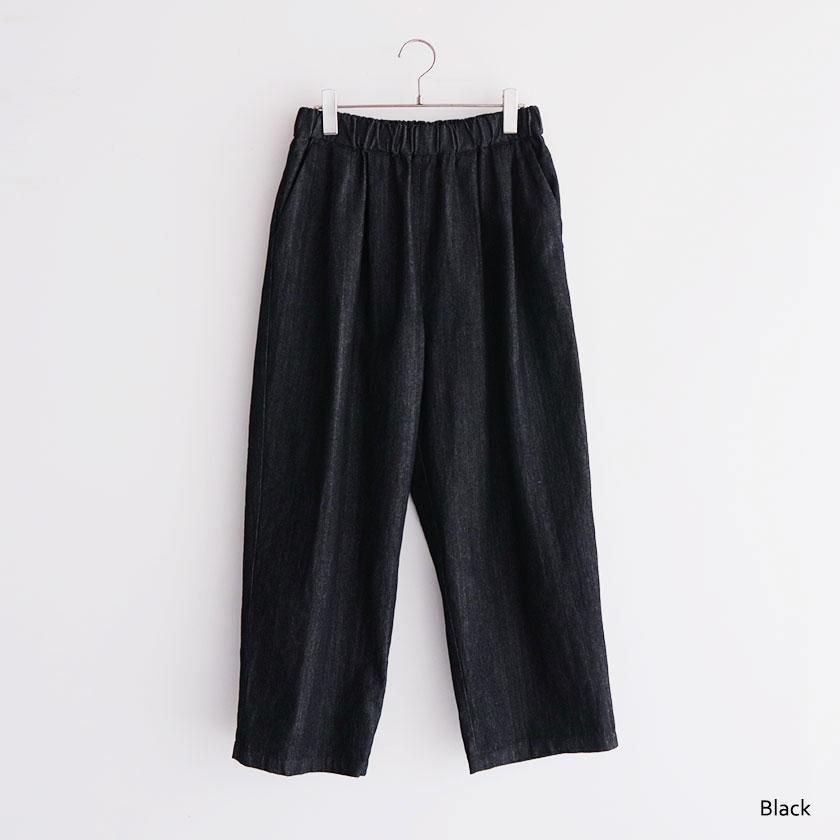 全体的にゆったりとしたシルエット。ヒップや太もも周りもゆったりしているので体型を問わず、どんな方にも穿いていただきやすくなっています。ウエストから入ったタックが縦のラインを強調して腰まわりをスッキリと見せてくれるので、タックインスタイルもスタイリッシュに仕上がりますよ。