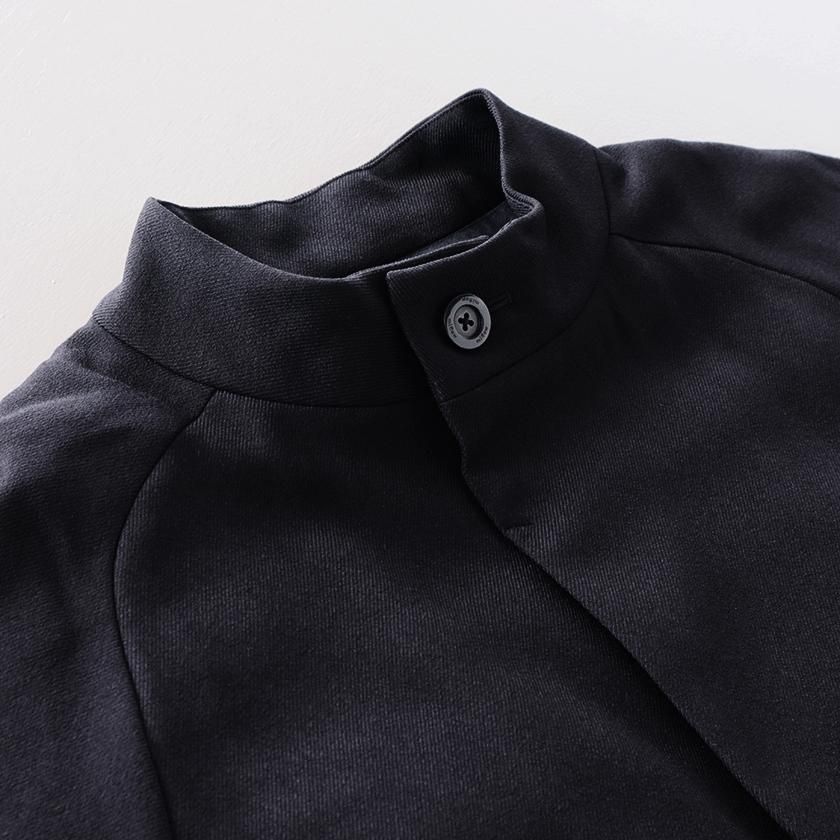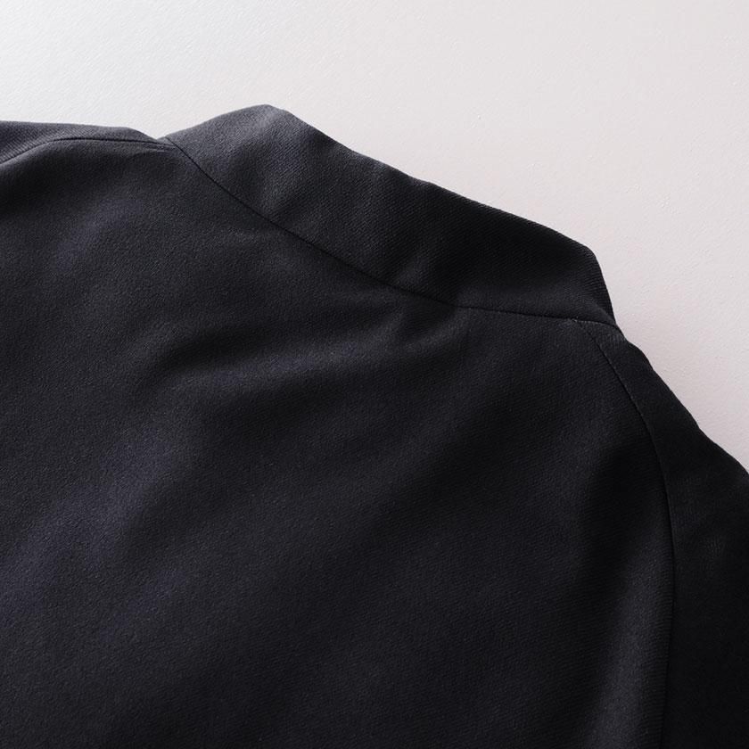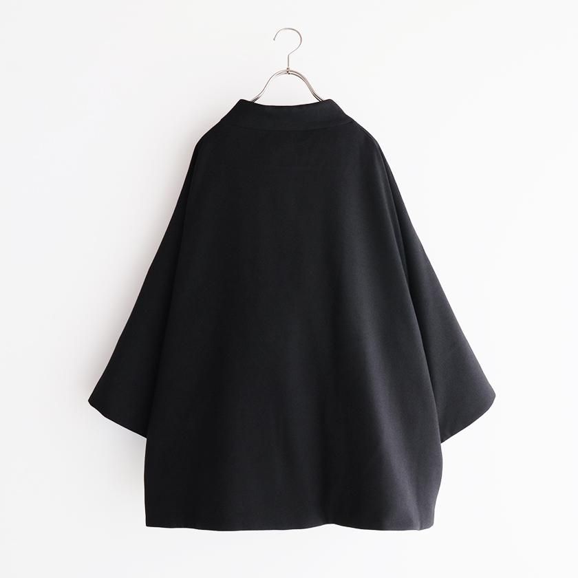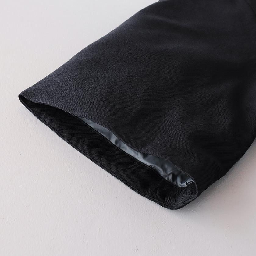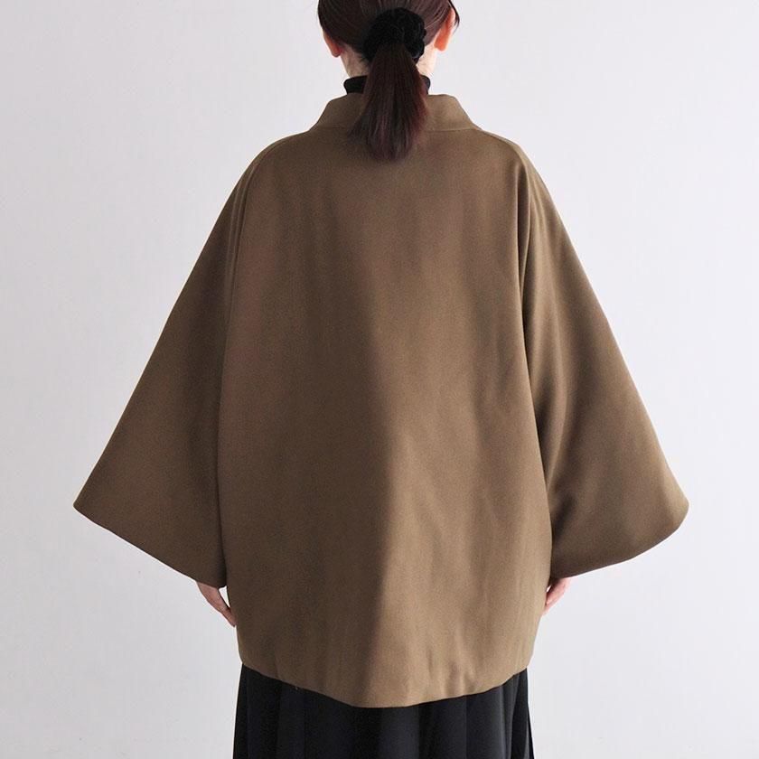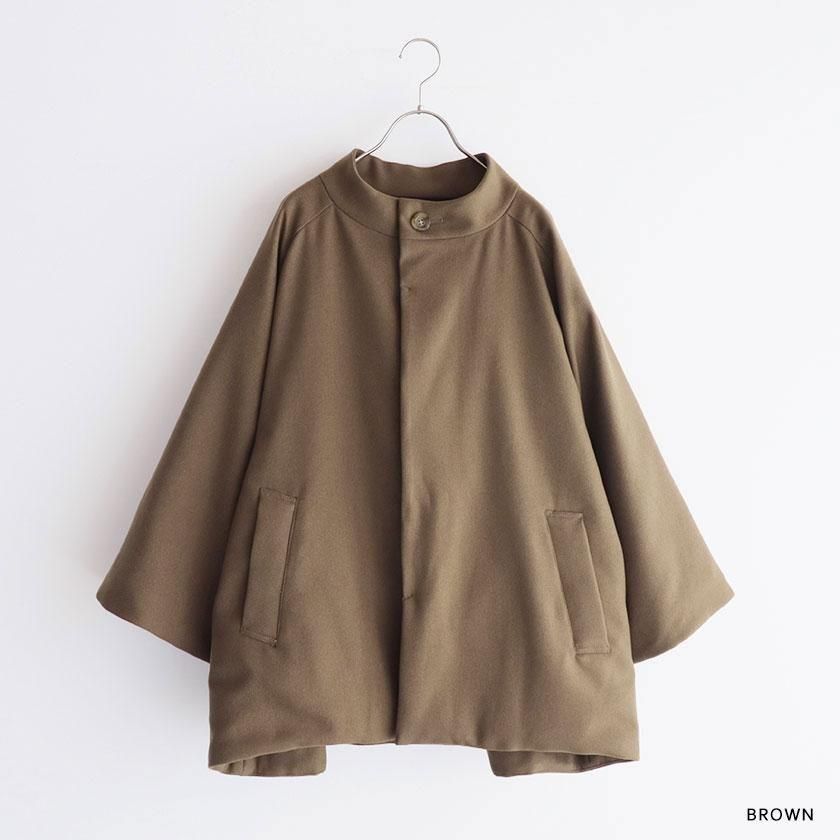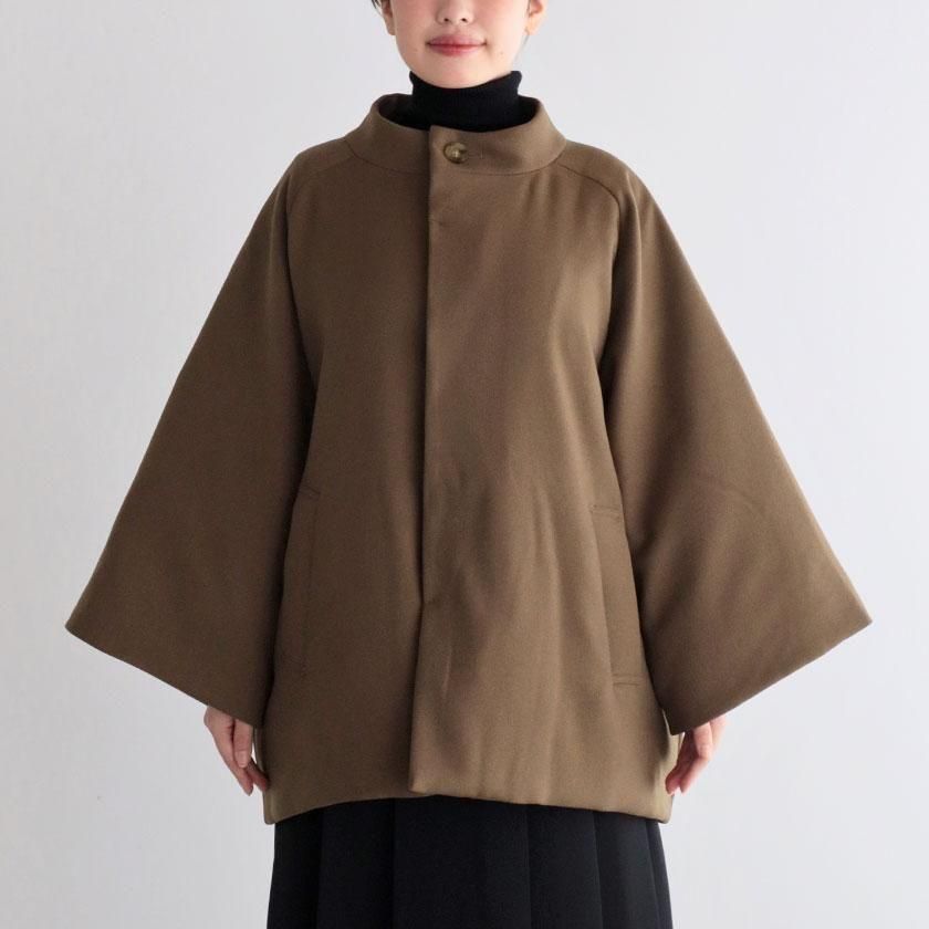 ケープのように広がるAラインシルエットが印象的。身頃や腕回りにたっぷりとゆとりを持たせており、厚着の多い真冬にも重宝します。ナイロン素材の滑らかな裏地付きで脱着もスムーズです。襟は首に沿うようにすっと立ち上がったモックネック仕様。中にタートルネックやシャツを合わせて襟を見せても可愛いですよ。フロントは襟元だけボタンが見える比翼仕立てでミニマルなデザインに。ボタンにはオリジナルの刻印入り。ポケットの内側はトリコットスエードを採用することで接触冷感を抑え、心地よい肌触りを実現しています。