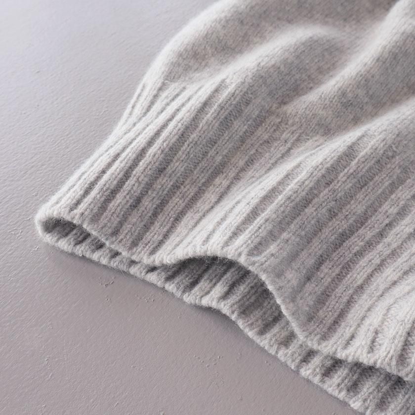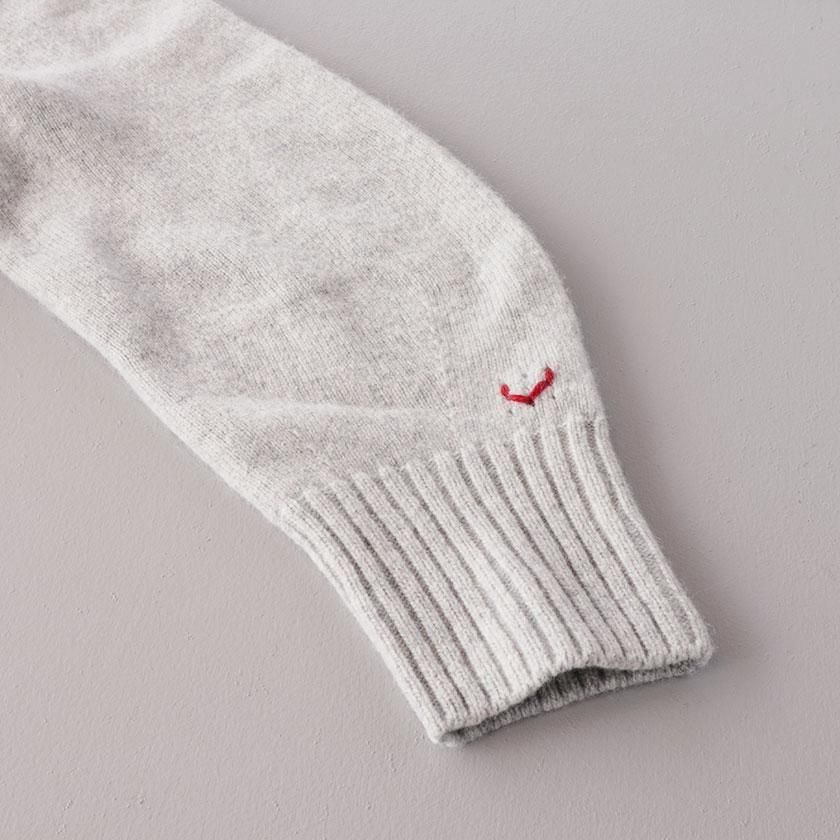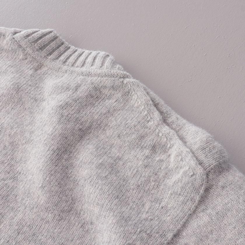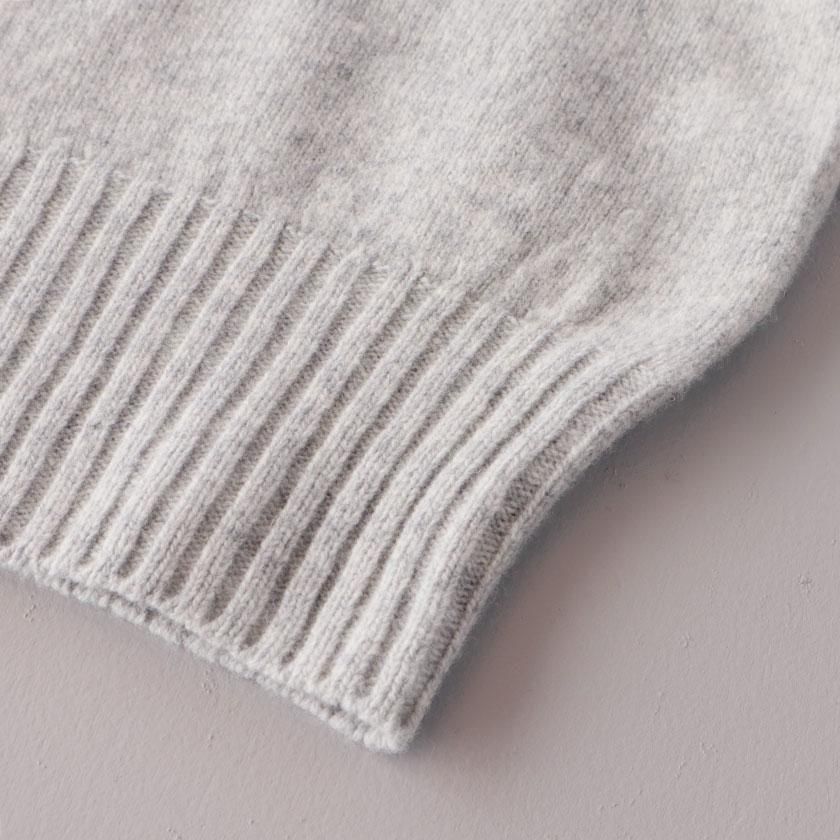 オーストラリア産のファインメリノ種にカシミヤをブレンドした紡毛糸を使用。メリノ種特有の弾力のある膨らみを活かし、緩めの編み地を少し強めの縮絨加工で膨らませるように仕上げています。さらにカシミアを少量ブレンドすることで少しヌメリ感のあるタッチに。直接肌に触れてもチクチク感のない柔らかな風合いが魅力です。