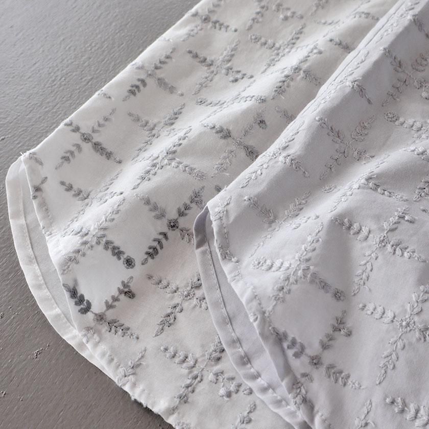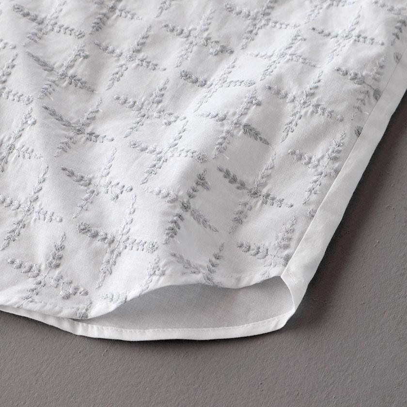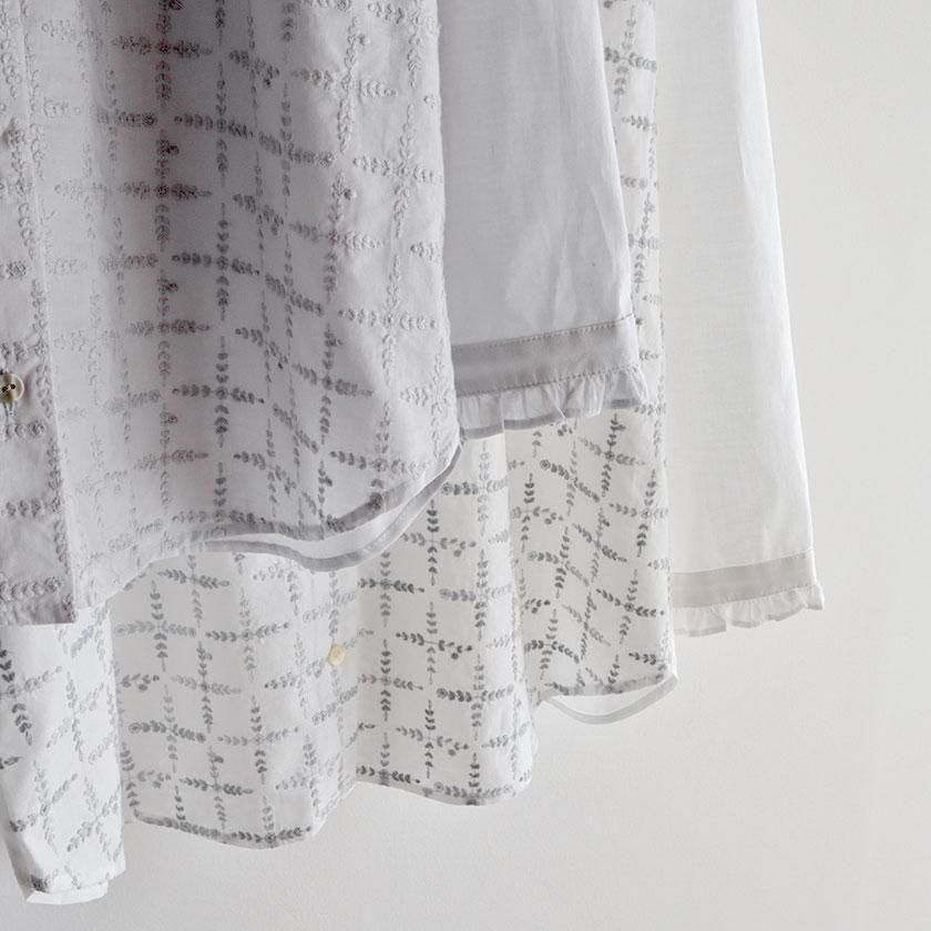 柔らかく上品な透け感のある60コットンローン生地。前身頃には富山県氷見市の工場で刺繍をあしらっています。「puutarha(プータルハ)」とはフィンランド語で「庭」「庭園」という意味。ひそやかに花が咲く様子をイメージしたスクエア模様が特徴的な刺繍デザインです。