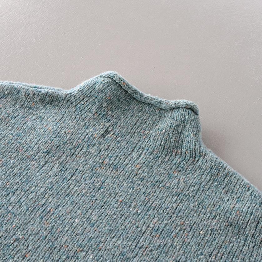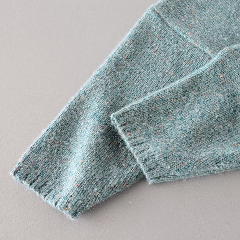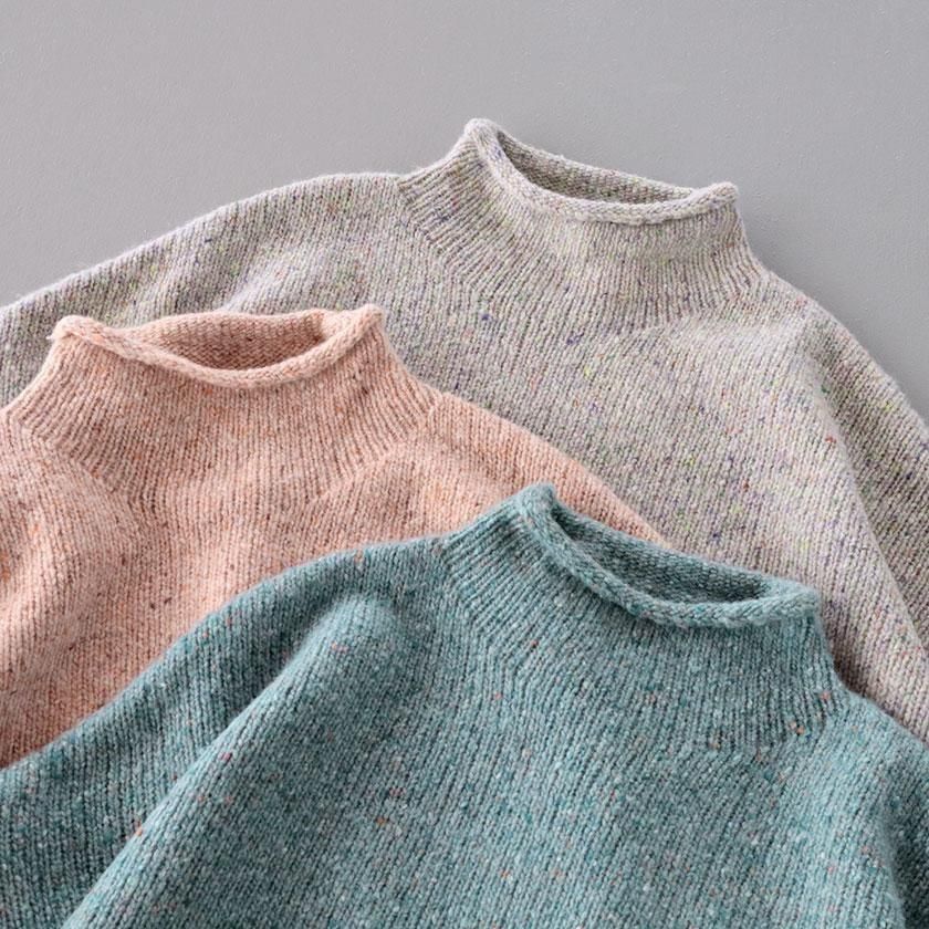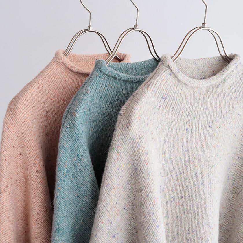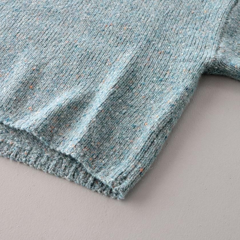 ざっくりとした編み地に、様々な色のカラーネップが入った表情豊かな一着。ナイロンの耐久性とウールの柔らかな風合いを併せ持ち、アルパカを混紡することでチクチク感を抑えたしっとり滑らかな肌触りに。ほどよい厚みがありながらずっしりとした重さはなく、気軽に着用いただけます。