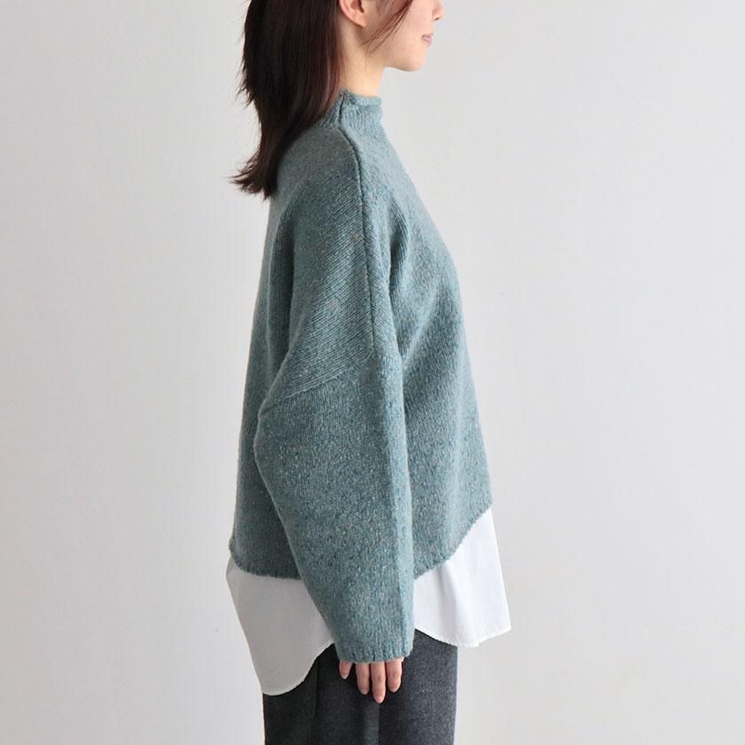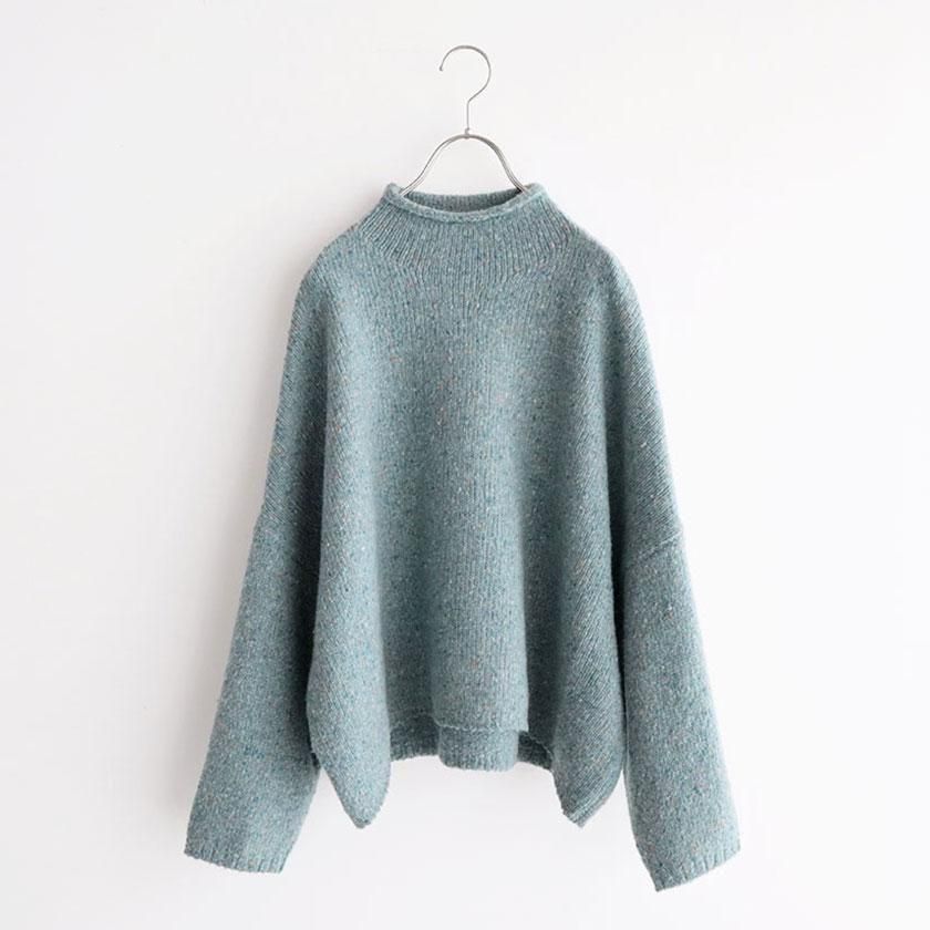 身幅や肩回りにゆとりを持たせたリラックスムード漂うシルエット。襟先がくるんとしたハイネック仕様なので首回りがピタッとしすぎず、首元も窮屈感なく快適です。着丈はややコンパクトに設定しており、ワイドパンツやスカートなどボリュームのあるボトムスともバランスよく決まります◎