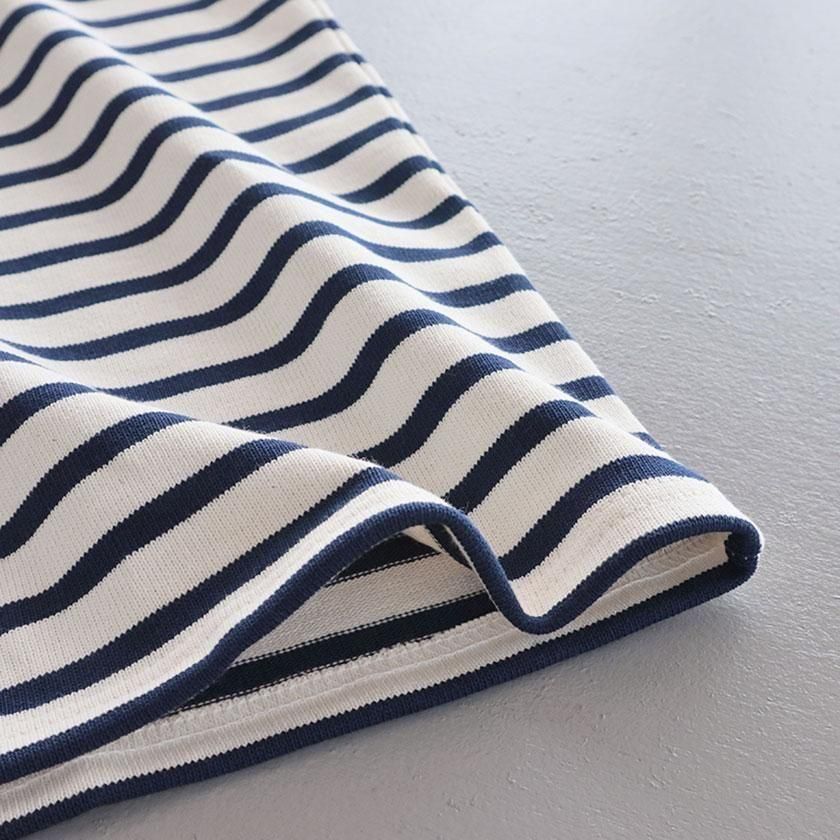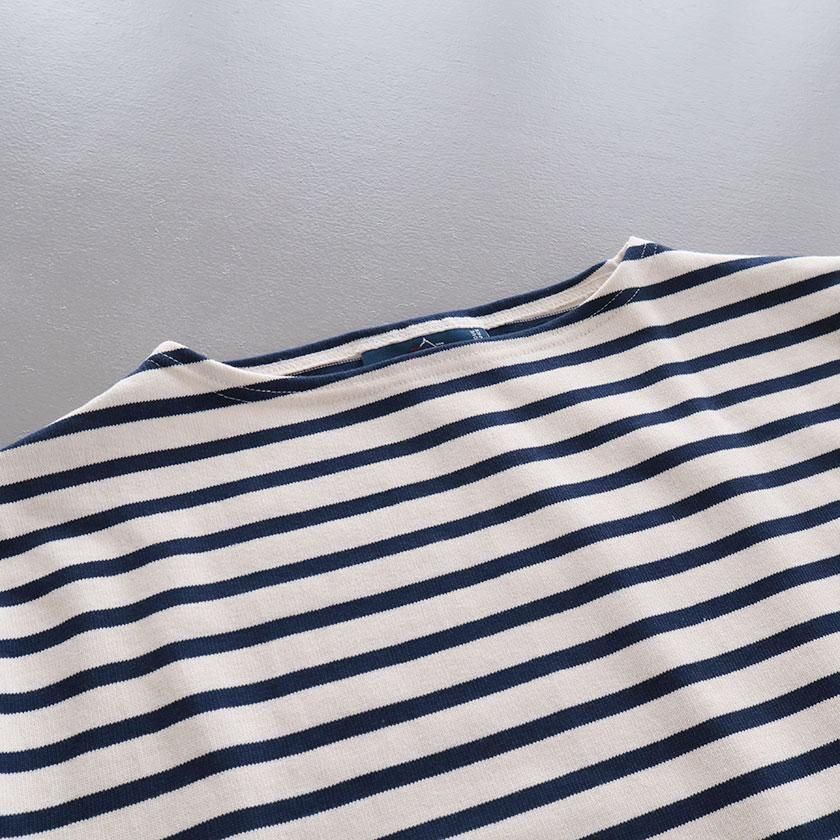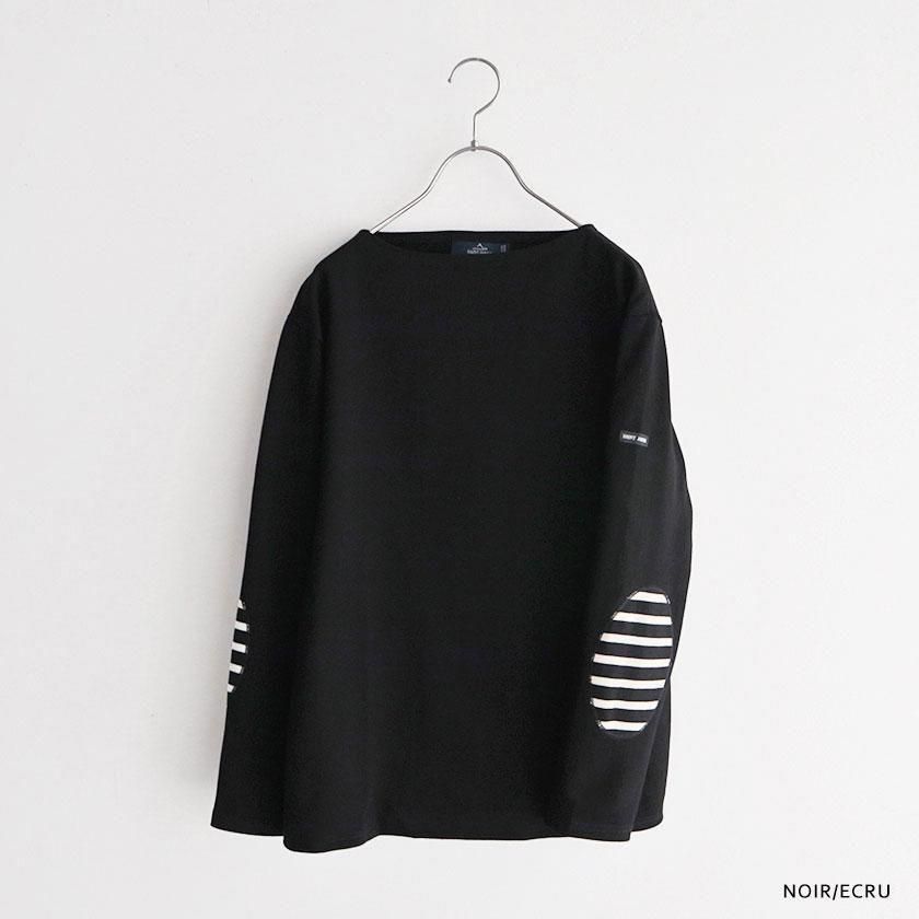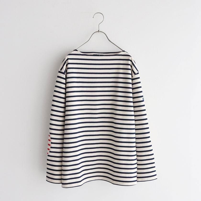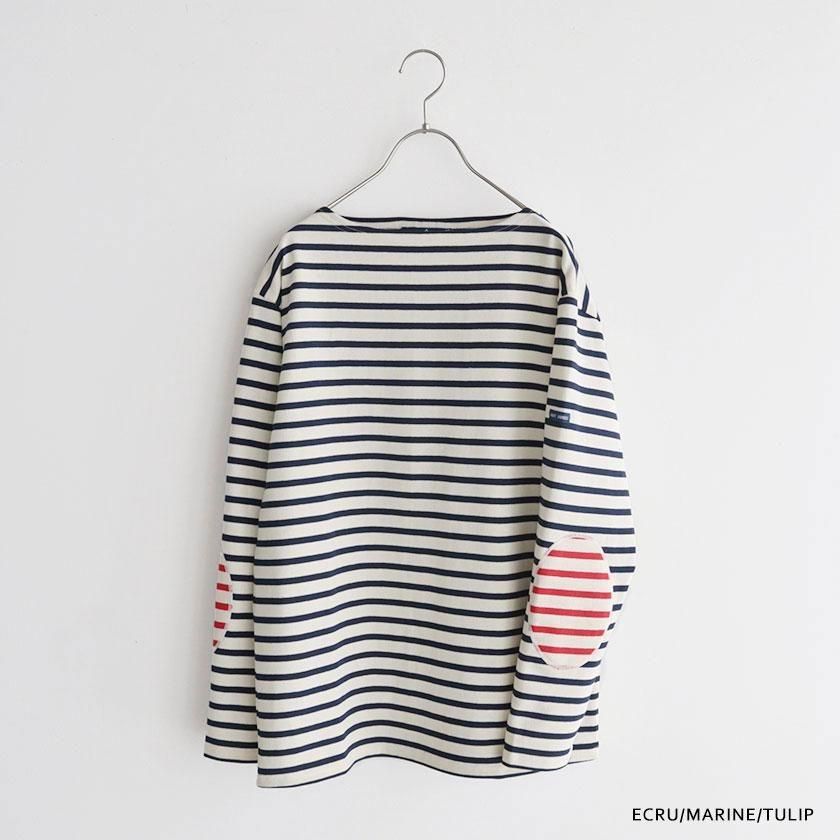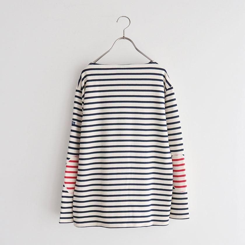 肘下のエルボーパッチはカラーによって柄やカラーが異なるデザイン。装いにほんのり個性をプラスしつつ、摩耗しやすい肘部分を補強するという機能性も兼ね備えています。デコルテをすっきり綺麗に見せてくれるボートネックや左袖のブランドタグなどバスクシャツらしいディテールはそのままに、よりカジュアルな仕上がりになっています。